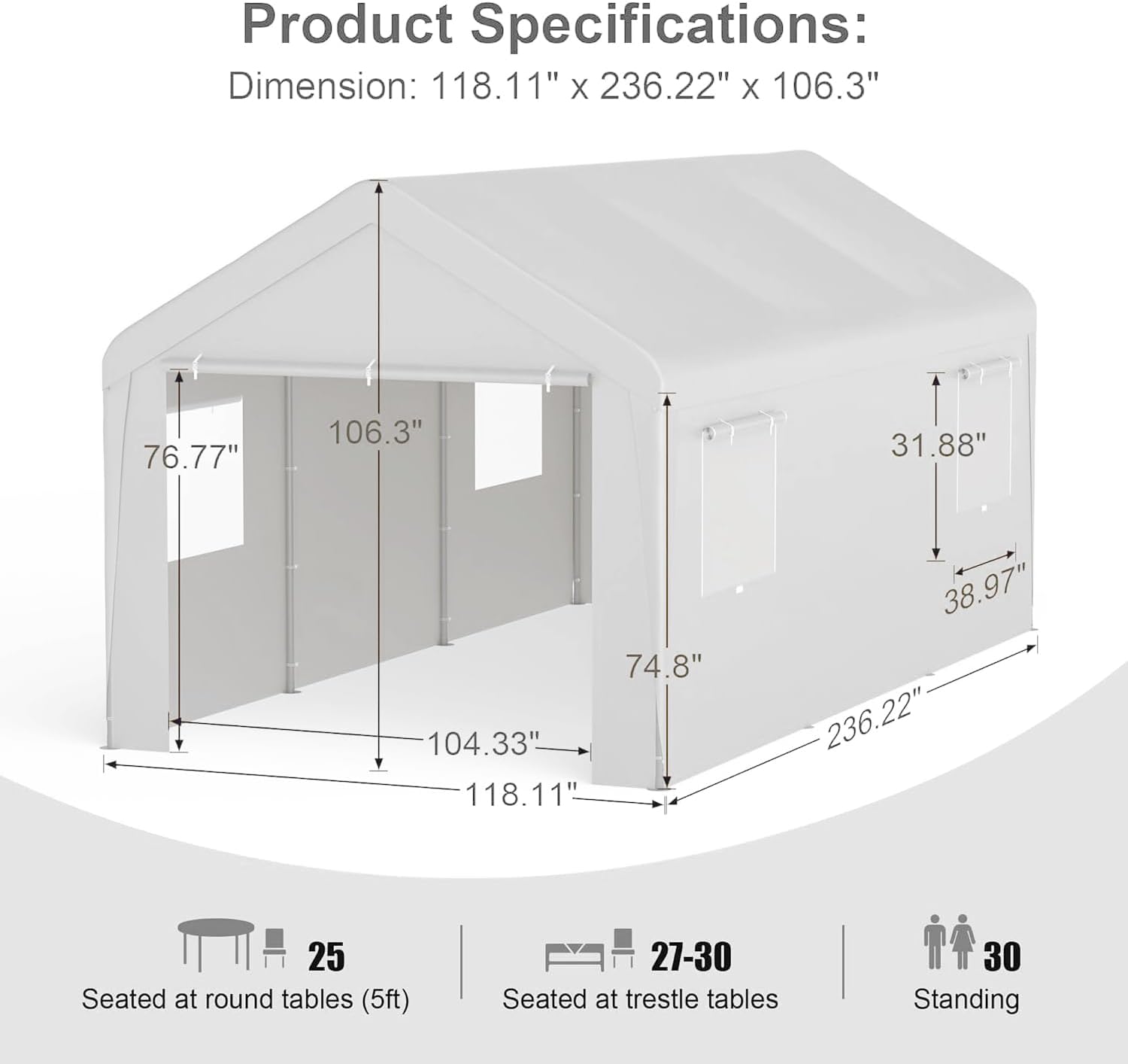 - Roll-up Zipper Door: Front and back doors with double zippers and buckles can be removable, make 10x20 heavy duty carport easy access for use and providing excellent ventilation