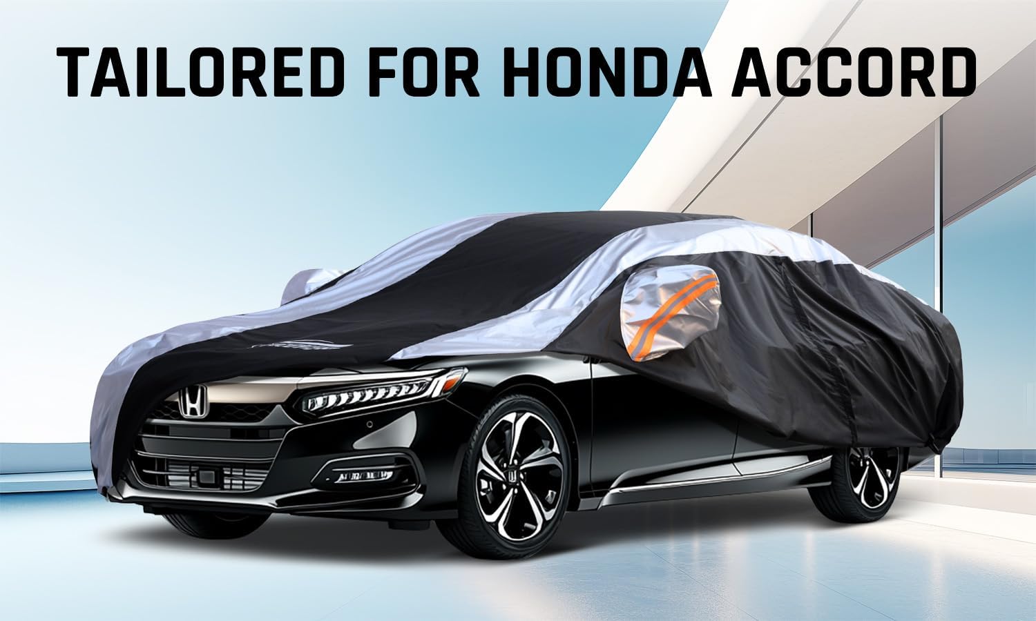 Honda Accord Car Cover Waterproof All Weather with Silver Strip Design, Custom Fit for Honda Accord 2005–2025, Accord Accessory with Door Zipper & Windproof Straps