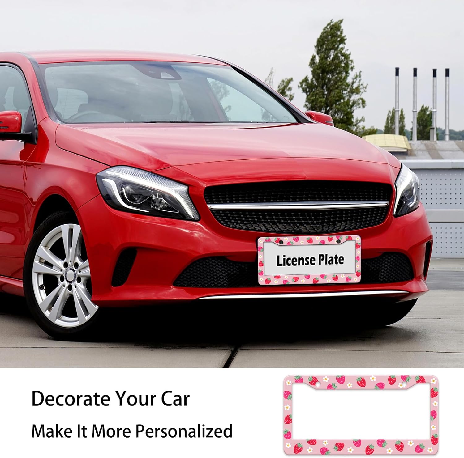Cute Strawberry Printed License Plate Frame, Strawberry and Flowers Frames Holder Covers, Metal Aluminum Rustproof Car Accessories for Us Canada Standard Women Men 2 Holes with Screw Caps
