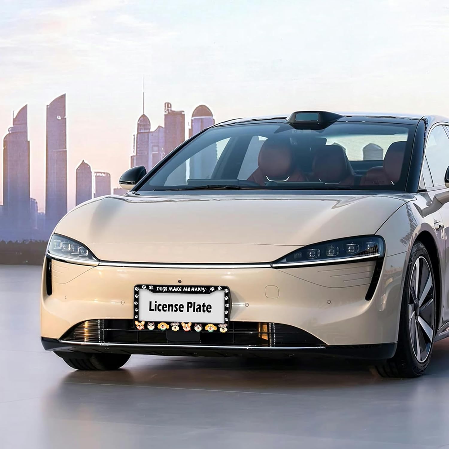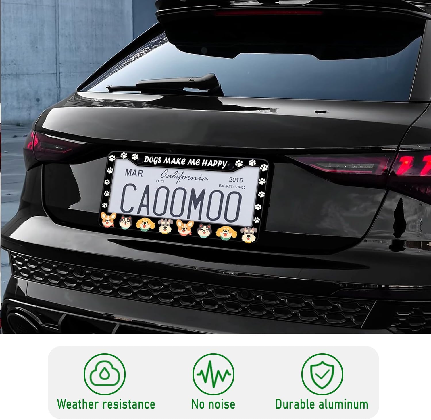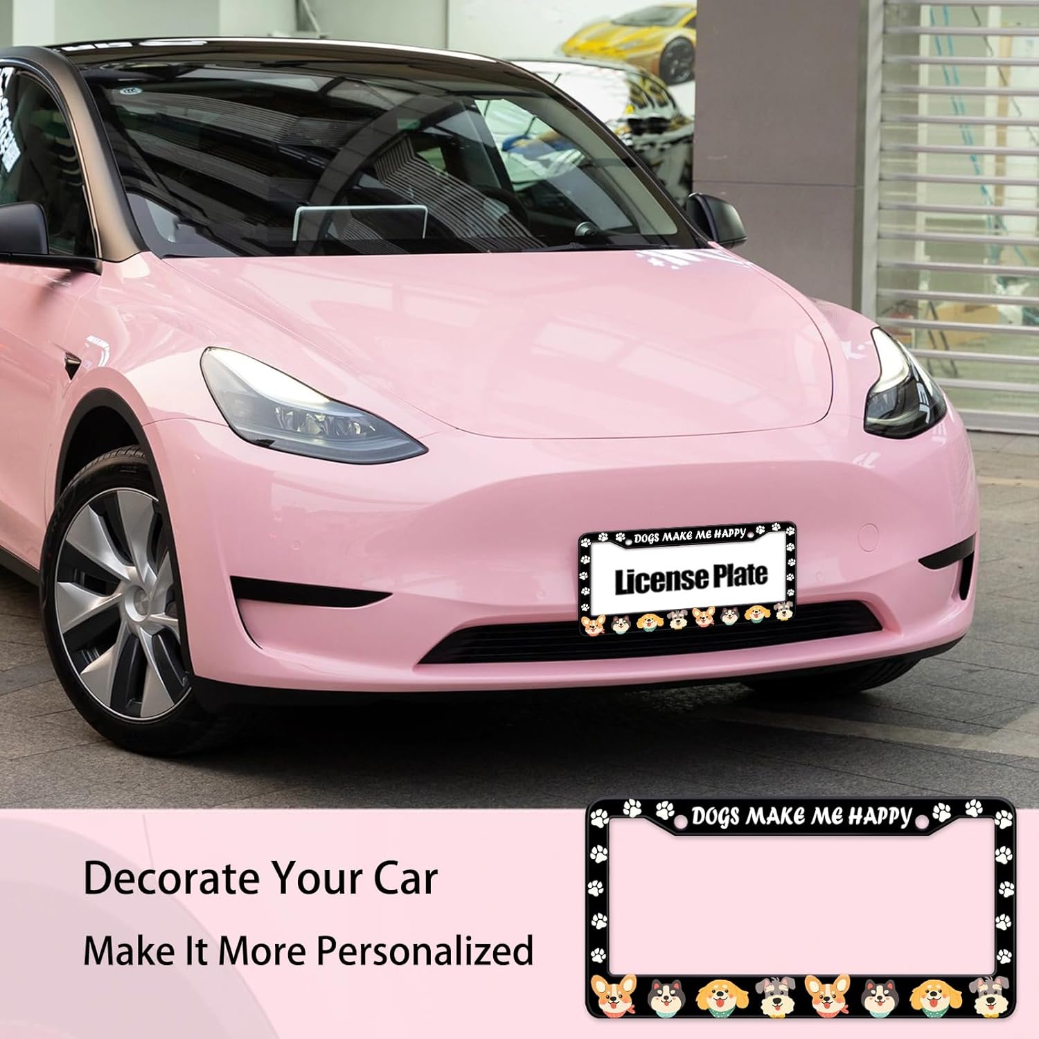 Dogs License Plate Frame, Lovely Puppies Dogs Paws Printed License Plate Holder Cover, Dogs Make Me Happy Metal Aluminum Rustproof Car Accessories for Women Men 2 Holes with Screw Caps