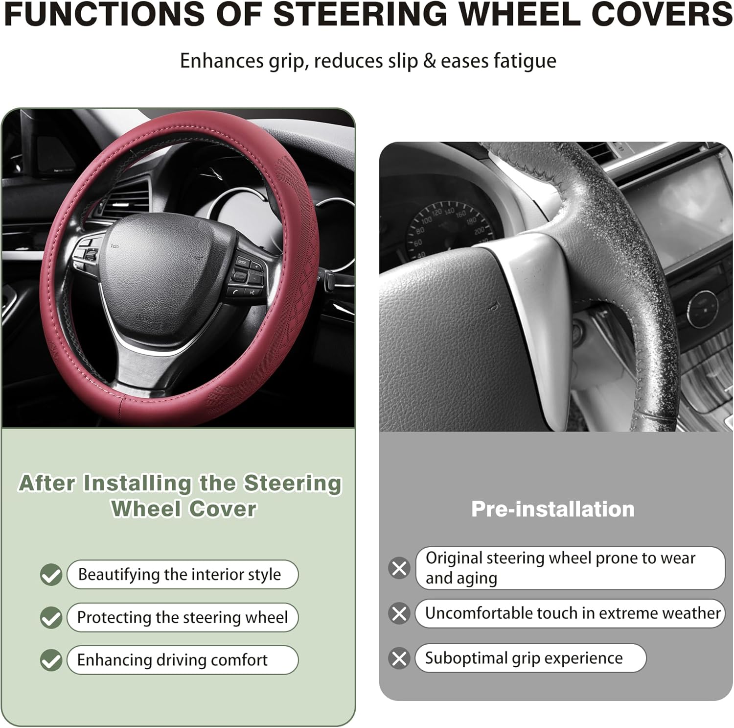 - 【Simple Installation】:It is easy to install. Due to the ductility of the material, any adult can easily install this steering wheel cover without tools.The creases will disappear completely after being fitted on the steering wheel for 1-2 days.