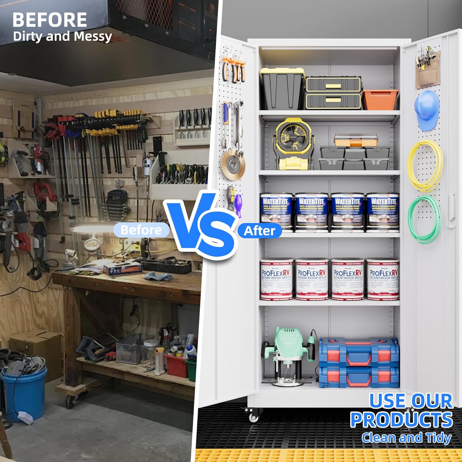 - Ample & Flexible Storage Solutions: Maximize organization with four adjustable shelves (customizable height) and pegboard on both doors, paired with 4 hooks for hanging tools, accessories, or gear. This design of the garage storage cabinet adapts to your needs, whether storing heavy-duty items or small essentials;