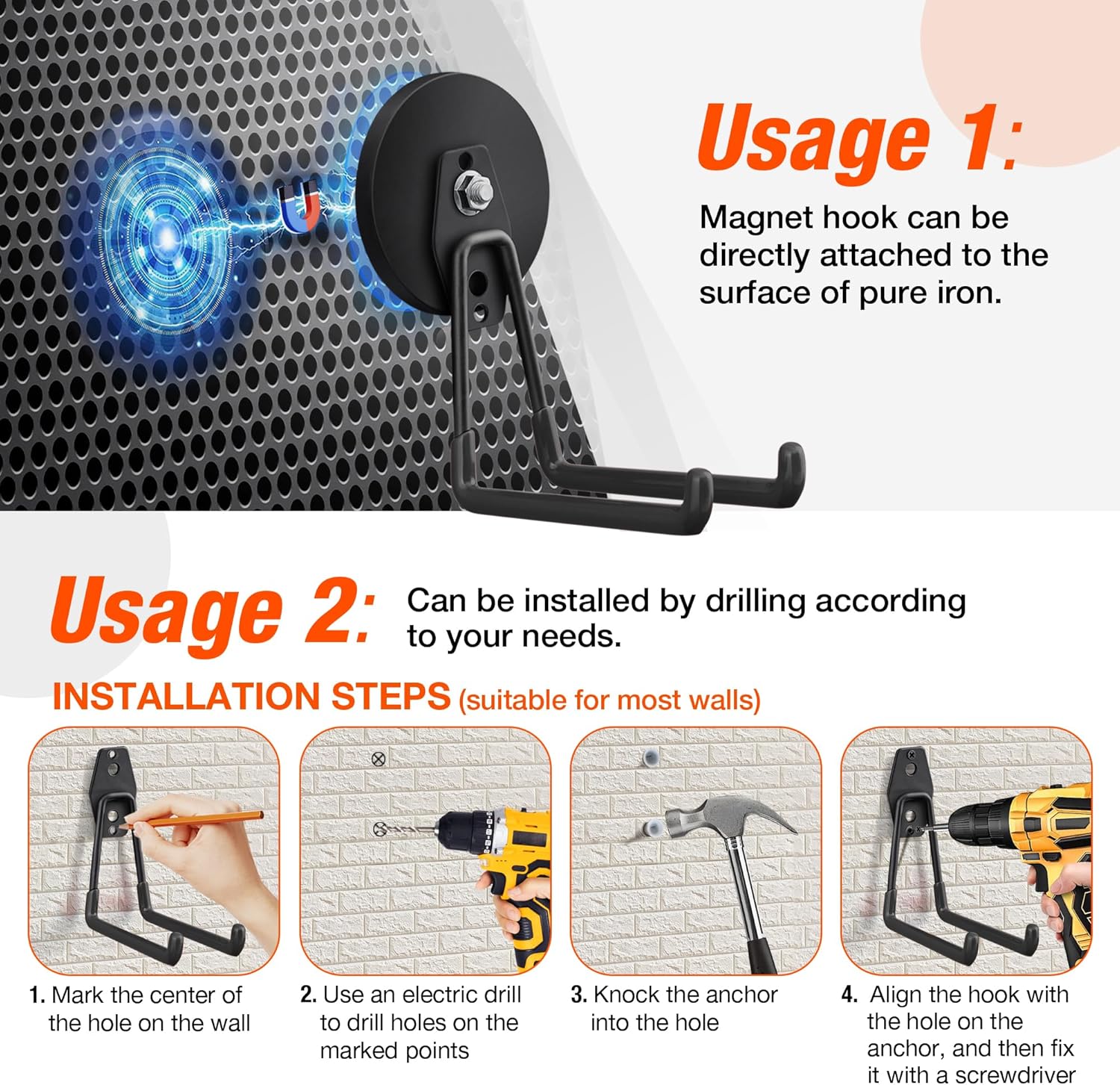 - 🧲[4PCS Magnetic Hooks For Hanging] Large strong magnetic hook present an efficient solution for optimizing vertical storage space within your garage organization system. These multifunctional extra magnet storage hooks are suitable for both indoor and outdoor settings, including garages, gardens, kitchen, warehouse, cruise cabin, utility rooms and indoor/outdoor