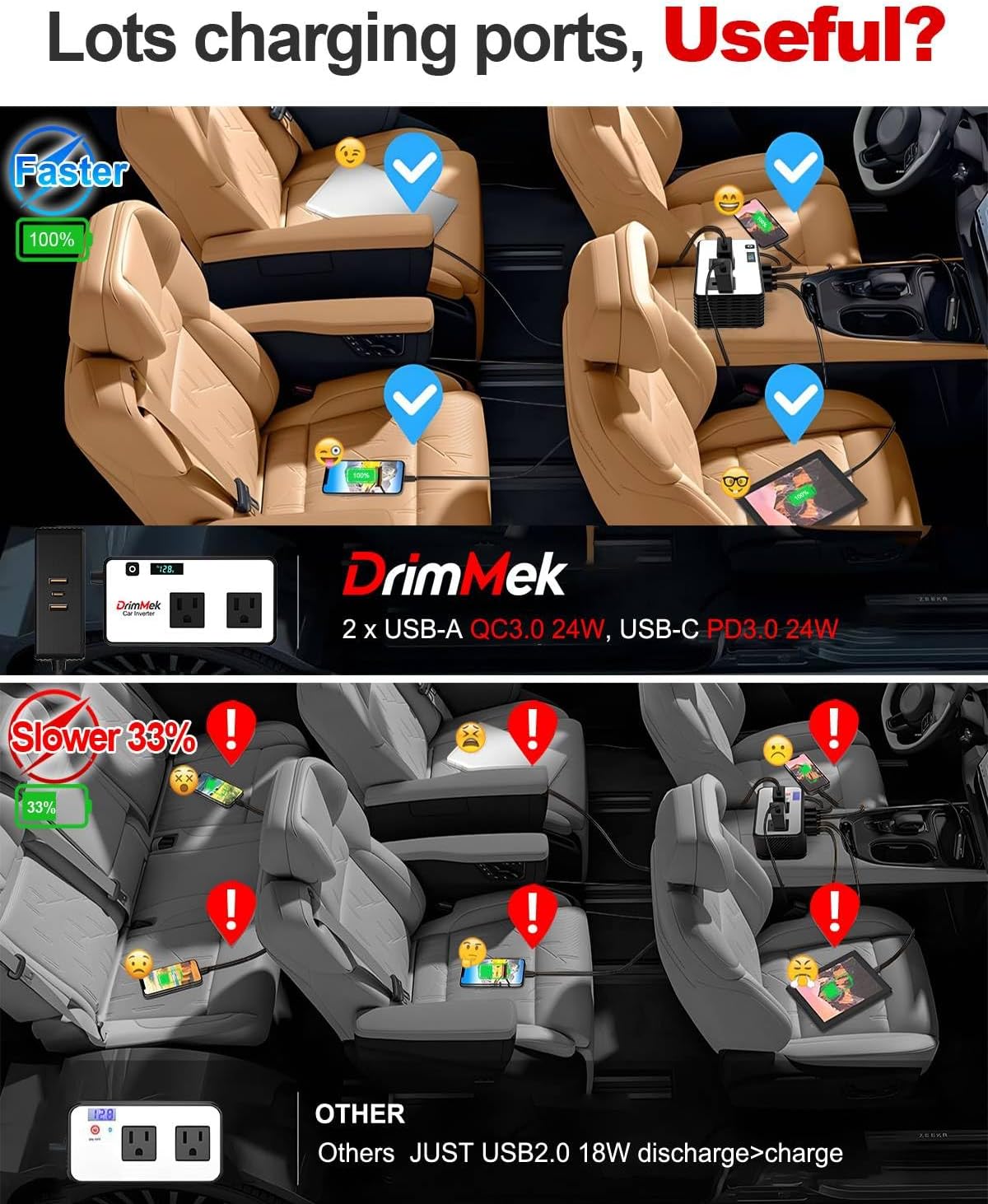 - 200W Car Power Inverter - The ultimate cigarette lighter power solution! Converts 12V to 110V AC via two outlets plus three USB ports (two 24W QC + 24W PD). Charges 33% faster than standard 18W/20W adapters - full charge in 30 mins! Powers laptops, phones, and small appliances. Just plug into your car outlet adapter and go. Ideal for road trips, camping, commutes, and emergencies. The perfect car essential with safety protections
