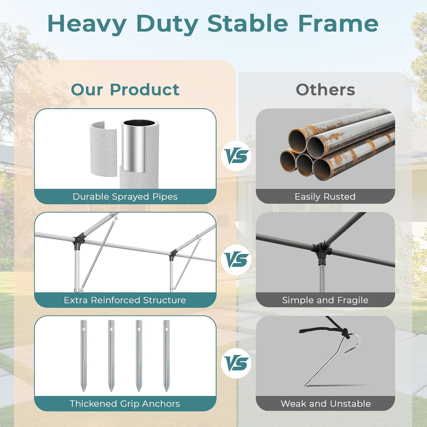 - Heavy Duty Carport Frame: Crafted with a robust sprayed steel frame, our carport is designed to resist rust, corrosion, and deformation. The screw-locking top beam enhances overall stability, preventing twisting or shaking. Additional reinforced triangular support rods bolster the structure, ensuring increased stability. With L-shaped thickened grip anchors, our carports are built to withstand various weather conditions. (NOTE: Recommended to fold it up in heavy snow, rain, or strong wind.)