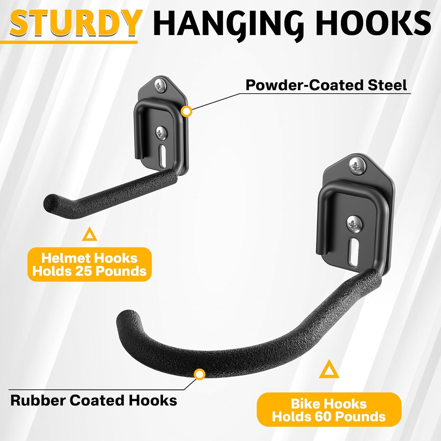 - High-Quality Adjustable Hooks: Heavy-duty hooks feature a thick rubber coating to protect and securely hold bikes and gear. Each bike hook supports up to 60 lbs, helmet hooks up to 25 lbs. All hooks are adjustable and easy to reposition or remove