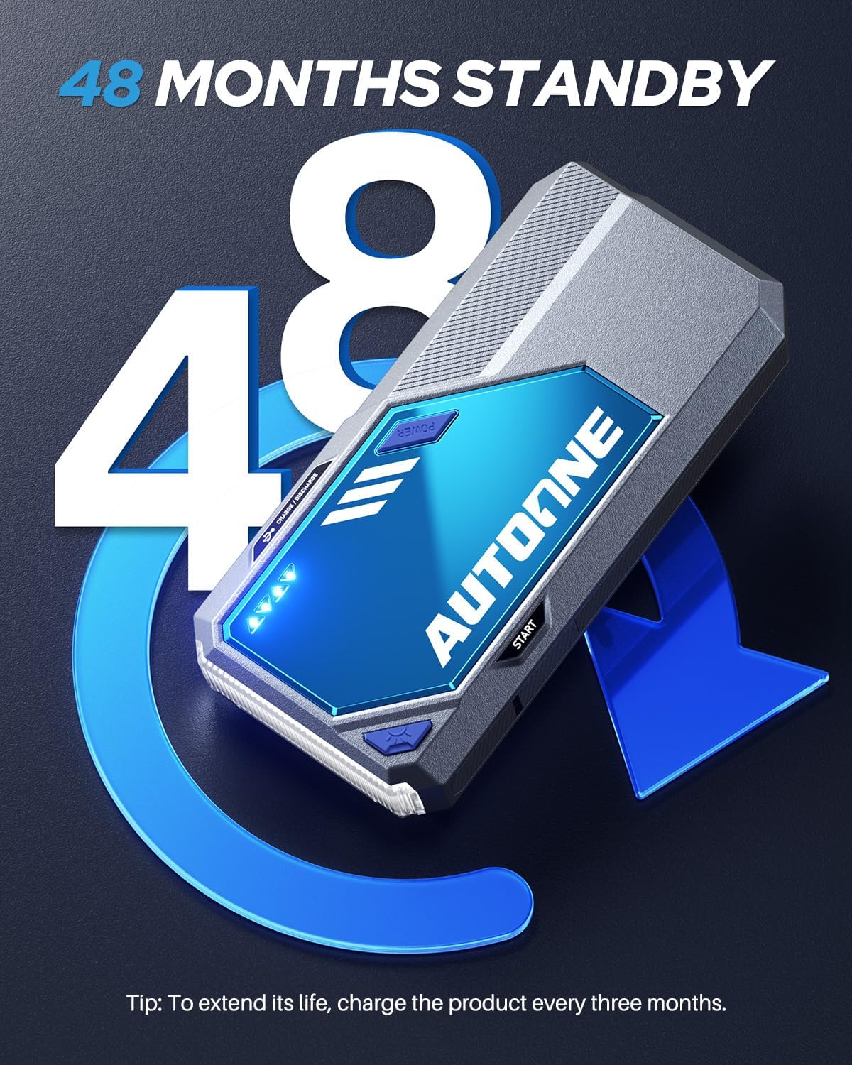 - True 16,000 mAh & 7500A Peak - What you see is what you get! AUTOONE M4 battery jumper starter portable delivers a real 16,000 mAh capacity and 7500A peak current—enough muscle to crank up to All gas and 12L diesel engines on demand, no slowdown.