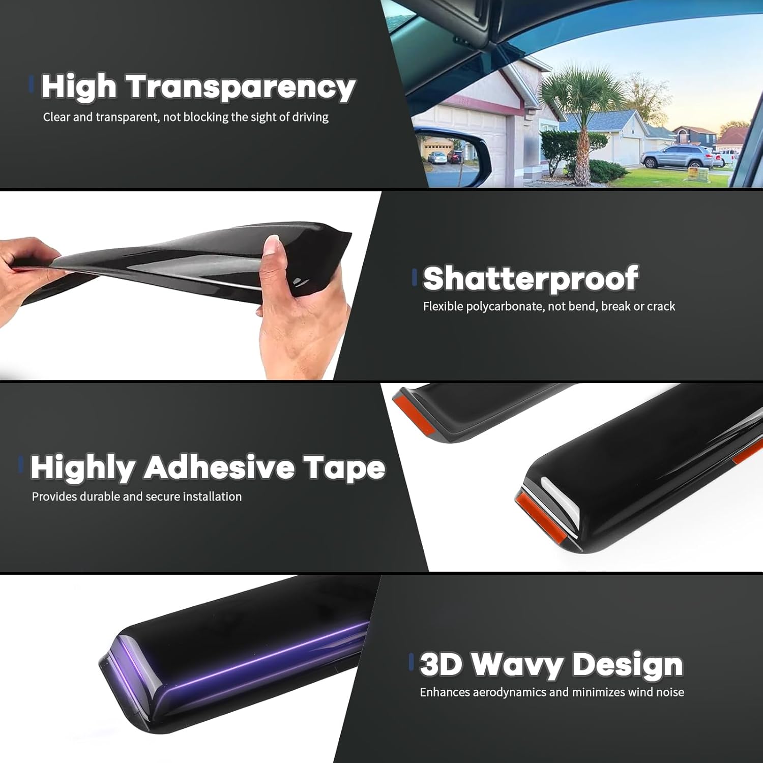 - 【Improved Ventilation and Air Flow】Allows fresh air to circulate through open windows while keeping the rain out or reduces heat. Reduce mirror and window fogging; reduce sun glare through side window. Dark Smoke translucent color will not obstruct the driver's view while driving