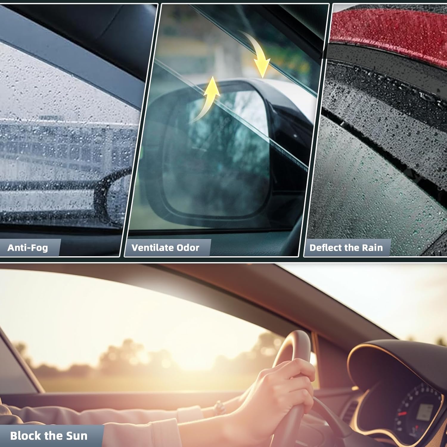 - 【Improved Ventilation and Air Flow】Allows fresh air to circulate through open windows while keeping the rain out or reduces heat. Reduce mirror and window fogging; reduce sun glare through side window. Dark Smoke translucent color will not obstruct the driver's view while driving