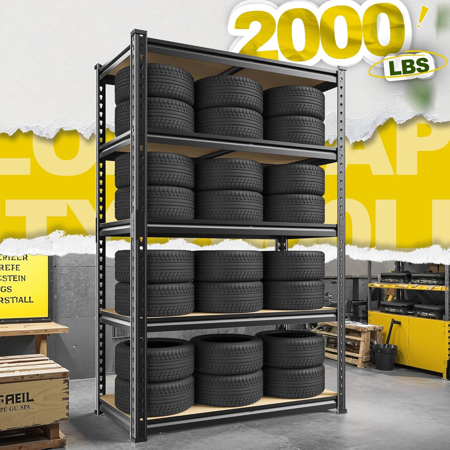 - 【2000LBS Garage Storage Shelves with Rolled Edge Design】The storage shelf is constructed from 5mm MDF and thickened metal frame. Rolled edge design of the metal column is not only thicker and better quality of the column, but also protect your hands from scratches. Each shelf with 1 rib beneath, each layer can hold up to 400LBS, with a total bearing capacity of 2000LBS.
