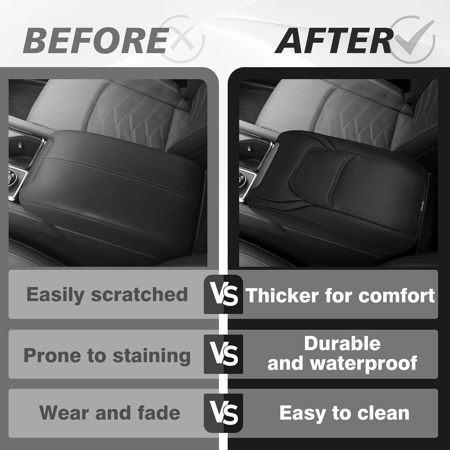 - Unique Design: Designed according to the OEM seat texture to make it match your interior perfectly. Our armrest cover is made of high-quality Vegan Leather with an extra layer of foam, which is skin-friendly, soft, easy to clean.