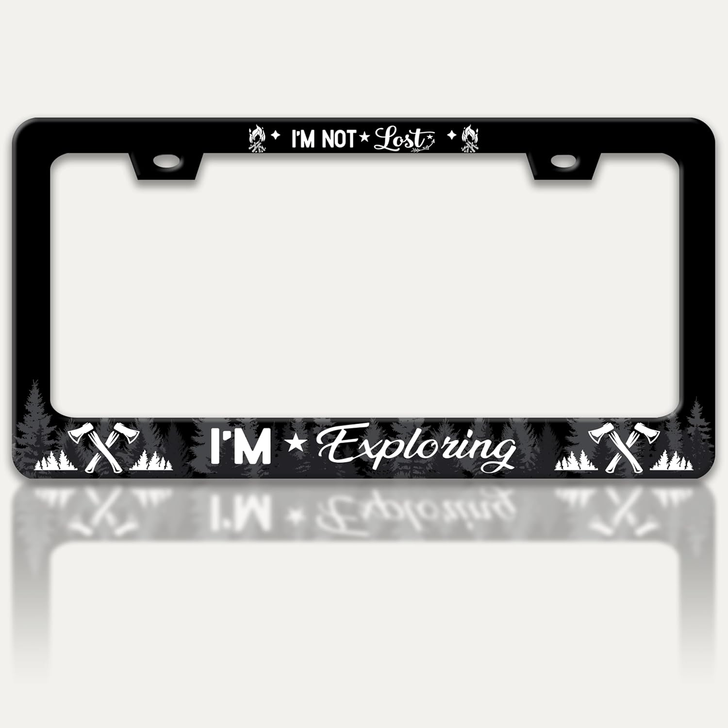 I'm Not Lost I'm Exploring License Plate Frame Adventure Forest License Plate Holders Funny Stainless Steel Auto Accessory Bracket 2 Hole with Screws Universal Us Car License Plate Frames 6x12 Inch