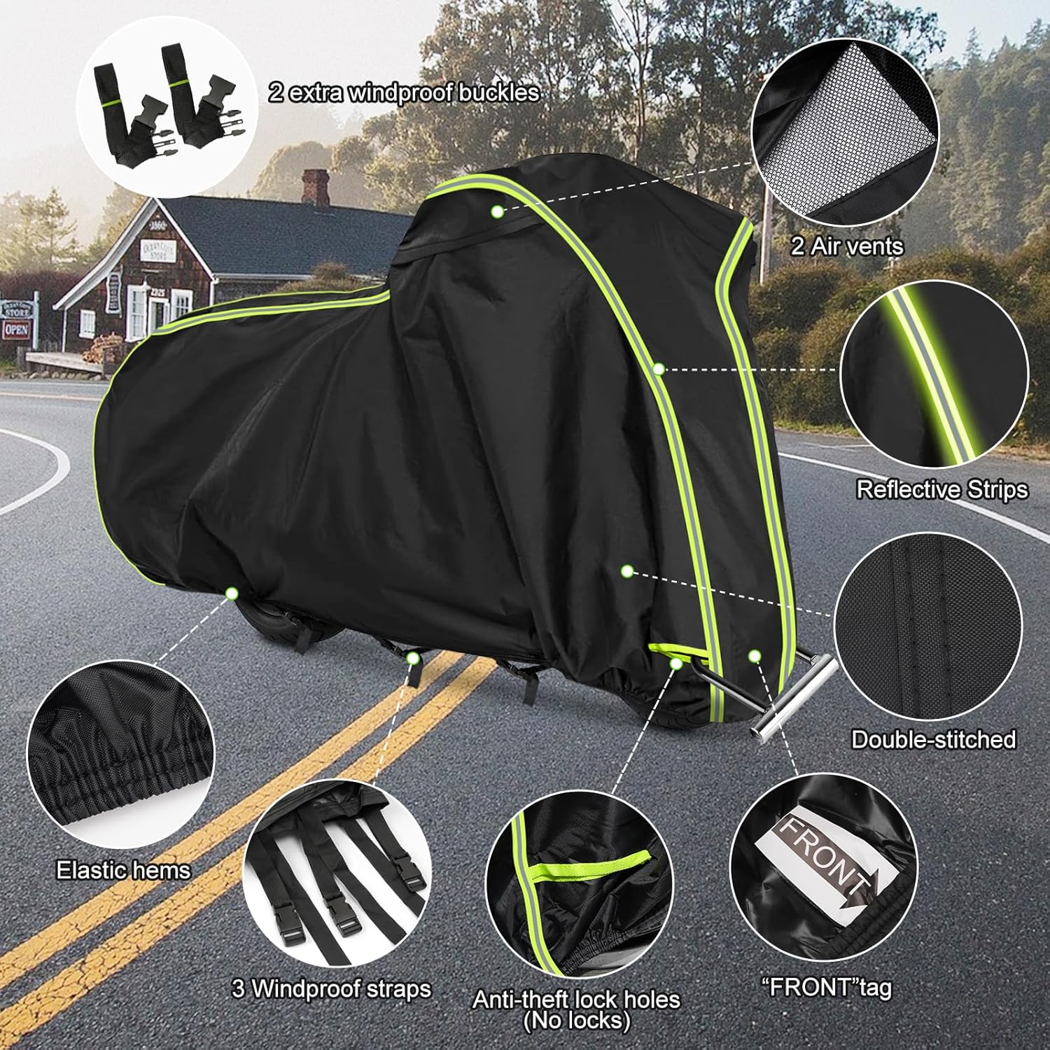 - 【All Weather Protection】1. 3 windproof buckles under the cover and 2 extra long straps are to make sure the cover stays in place. 2. Front and rear Elastic hems on the bottom to keep the cover from being lifted by wind and for a snug and secure fit. 3. Double-stitched & Waterproof Strips make the motorcycle cover better waterproof, with no water seepage