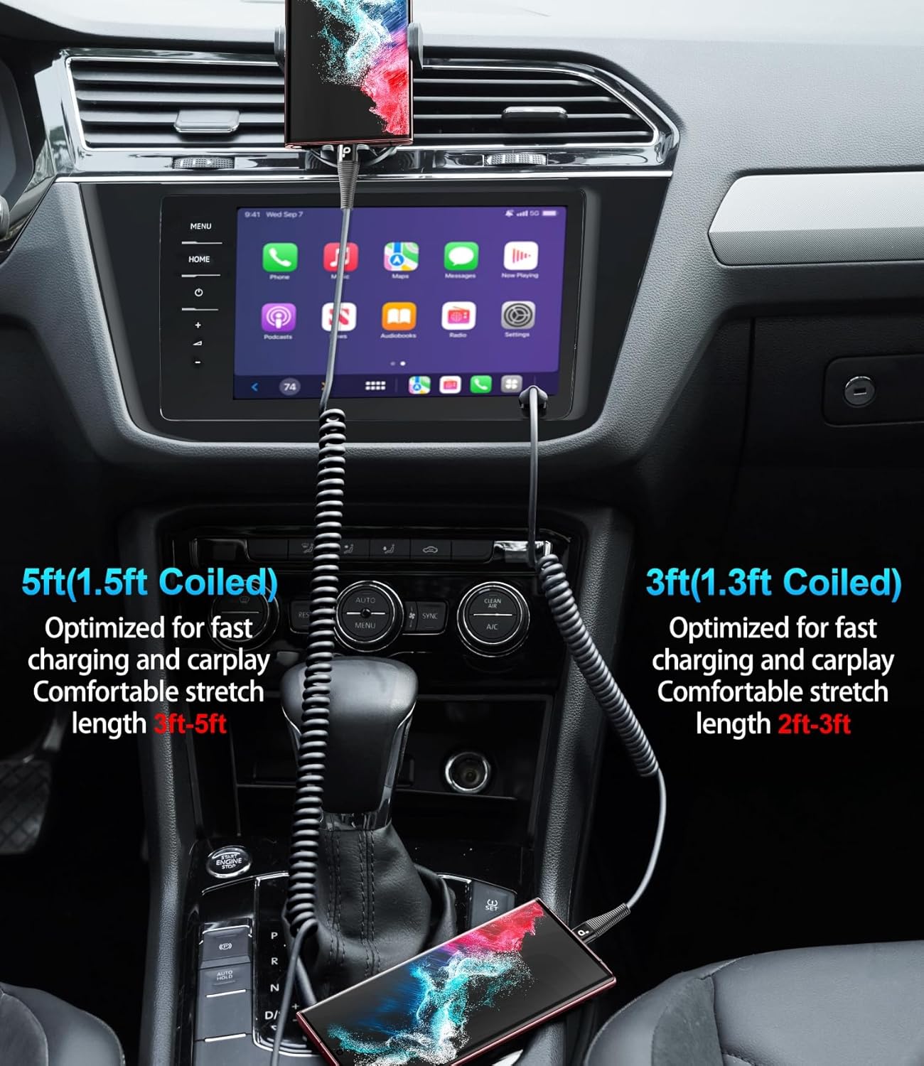 - USB C Cable Made for Car: The USBC car charger cable is designed with stretchable, no tangle, no knot, and does not take up space. This coiled USB-C to USB-Ccharging cable is made of upgraded high quality PU material, which is flexible, easy to stretch, effortless, quick to rebound and not easily deformed.