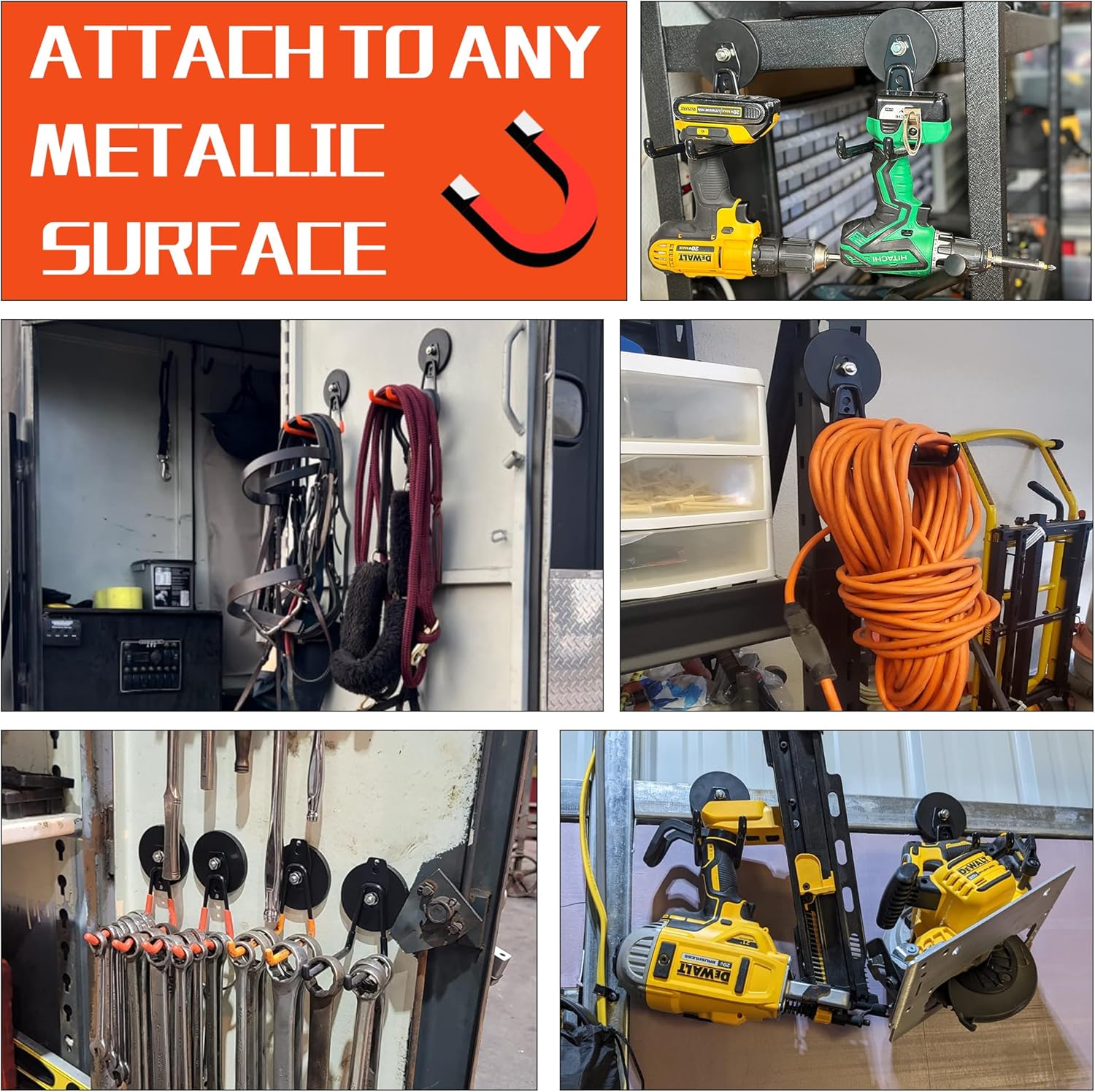 - [Heavy Duty Magnetic Hook]: Garage storage hook has two holes, which can easily support the weight and can hang most items. Applicable to scenes such as kitchens, garages, warehouses, offices, etc.Can accommodate various tools and equipment, such as hoses, skates, gym bags, shovel, rake, broom, mop and other garden tools