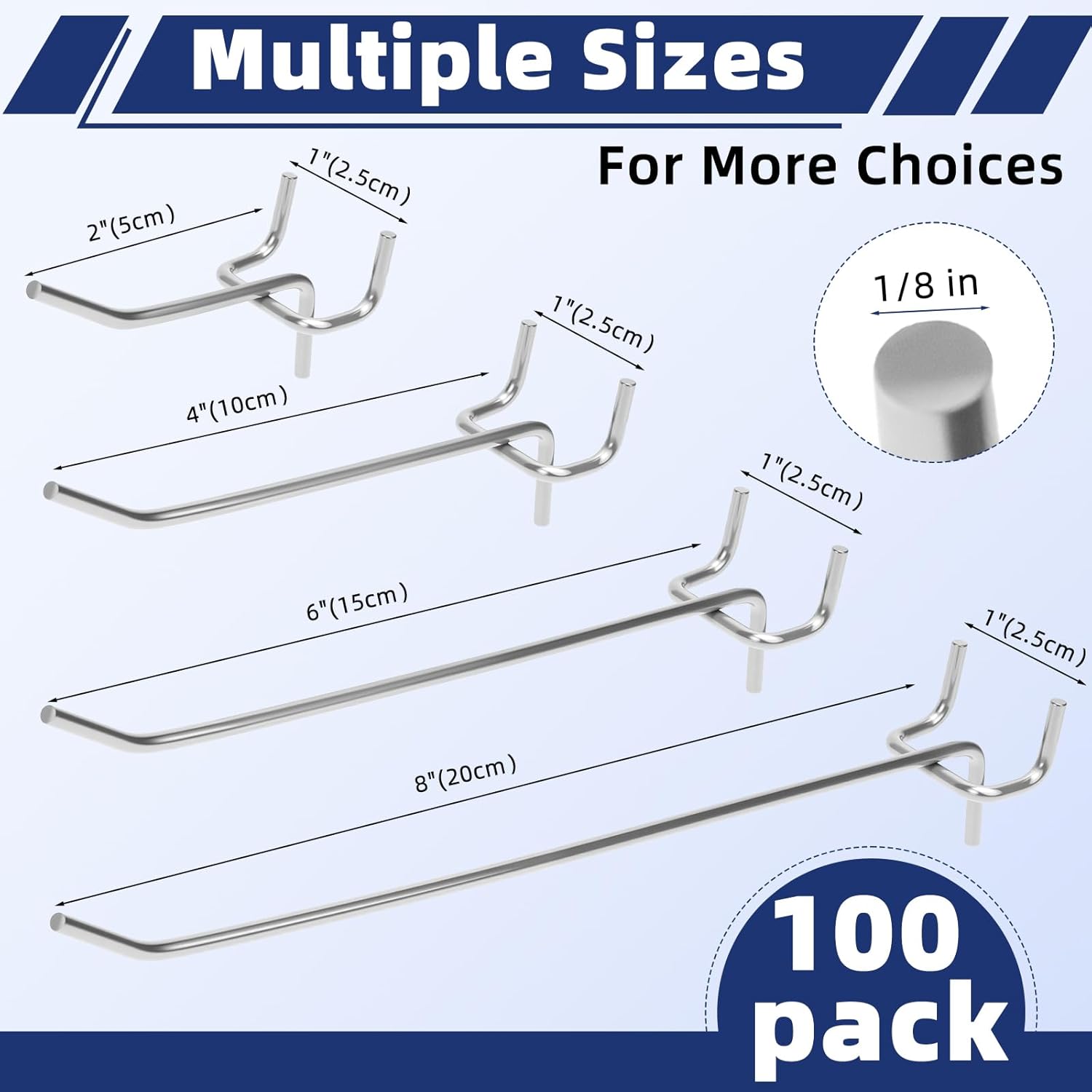100 Pack Pegboard Hooks Heavy Duty 4 6 8 Inch Pegboard Hooks 1/8 Stainless Steel Peg Board Shelving Hanging Tool Pegs Organizer Accessories Kit for Garage Kitchen Store Craft Organizing Wall Storage