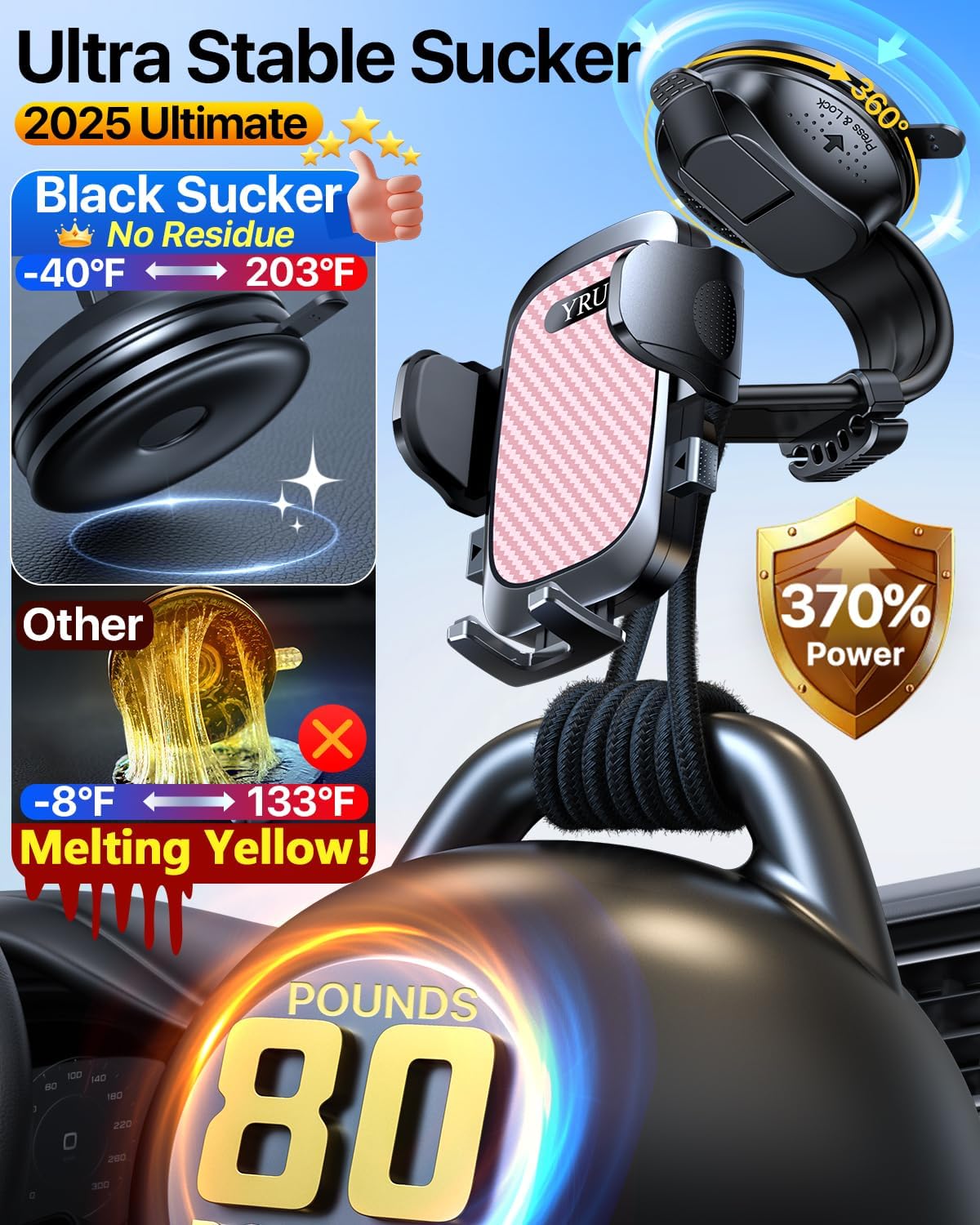 - Upgraded 80lbs Rotatable Sucker, Ultra Stable & Reusable: The phone car mount suction is up to 80lbs stable. Made of German nano adhesive material (temperature resistant -40°-203°F). 360° rotatable in any direction. Not Drop, Not Melt, Removable, Washable, and Reusable