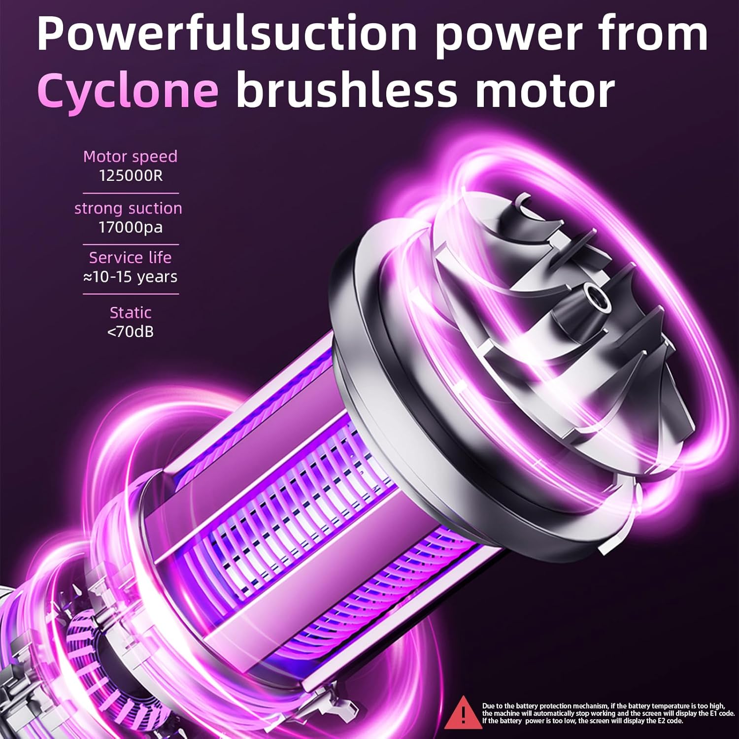 - Due to the battery protection mechanism, if the battery temperature is too high, the machine will automatically stop working and the screen will display the E1 code. If the battery power is too low, the screen will display the E2 code.