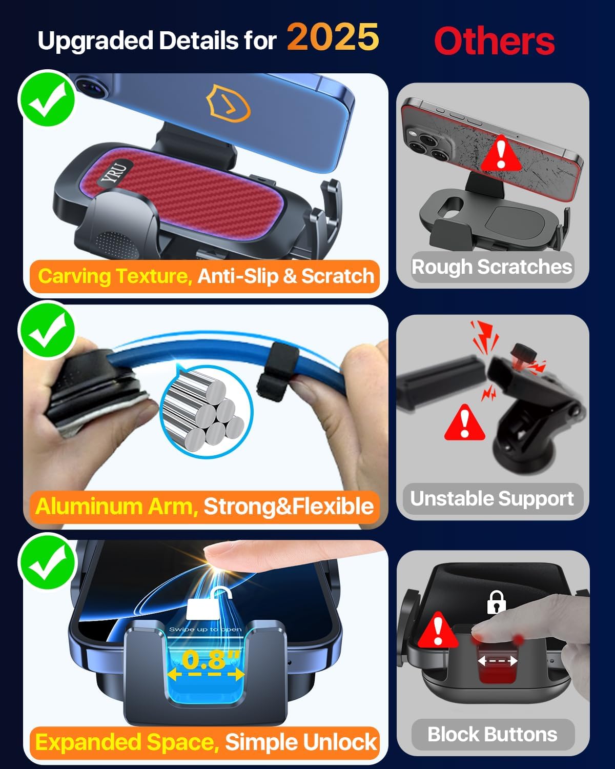 - 2025 Ultimate & High-End Car Holder, Trusted by 30,000+ Users: YRU 2025 upgraded car phone holder with 4 years of R&D passed 30,000+ users driving 900,000+ miles test, is a 3A-Grade reliable car mount, stable & durable. Got safely certified