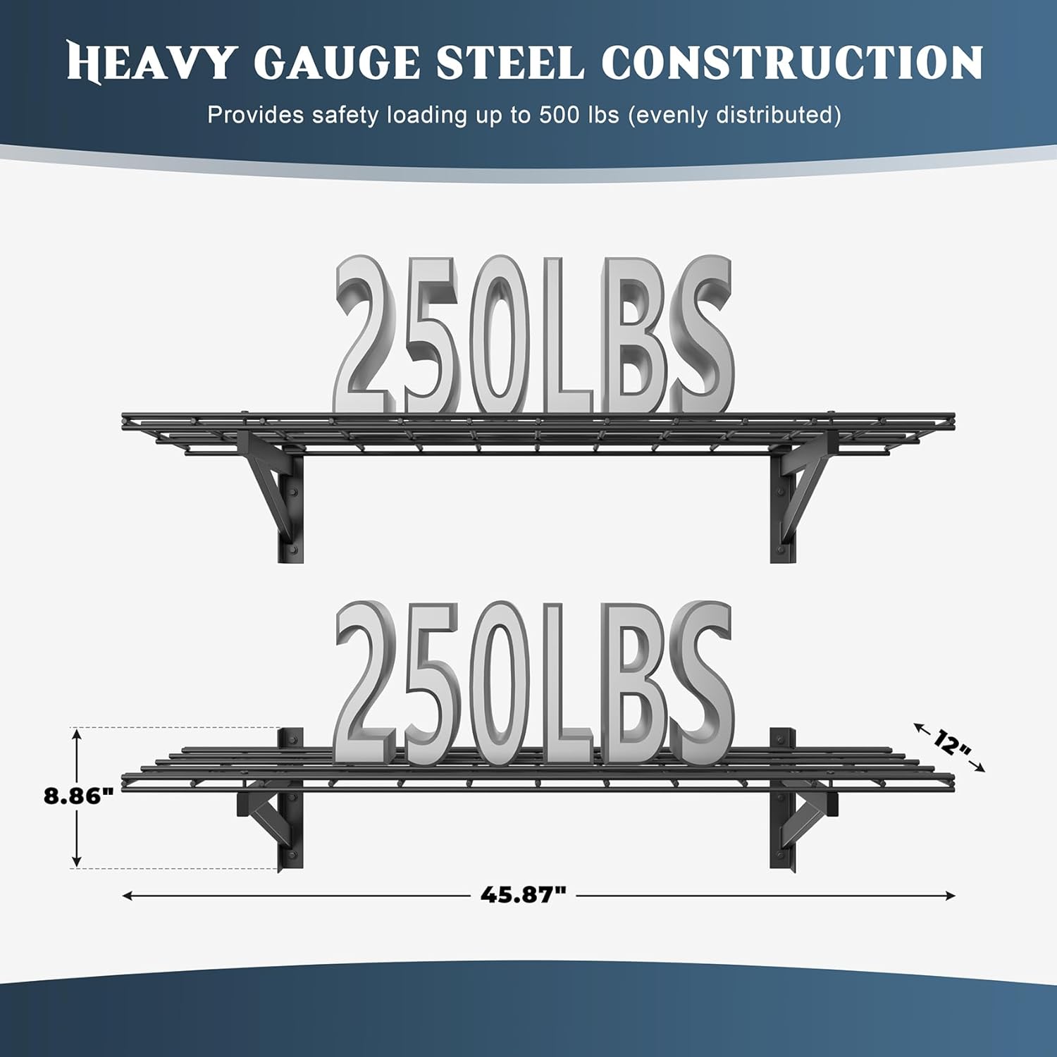 - 🏆【Heavy-Duty Load Capacity】- Jusgym garage shelving wall mounted system is engineered with premium steel, offering exceptional strength. Each 1x4ft bracket holds up to 250 lbs, and with 2 shelves totaling 500lbs capacity, it effortlessly stores bulky items like tools, tires, and heavy storage bins. Built to last, even under extreme weight!