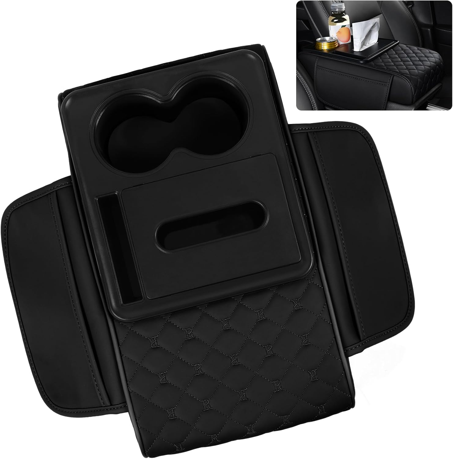 - 5-in-1 Multifunctional Design: Our car center console cover features 2 cup holders (2.8 inches in diameter), or 2 beverages, 1 phone slot (6.4 inches), 1 tissue box (5.3 x 3.5 x 2.4 inches), and 2 side pockets (7.8 x 5.1 inches) for storing keys, coins, credit cards, and other small essentials – all complemented by a supportive armrest pad