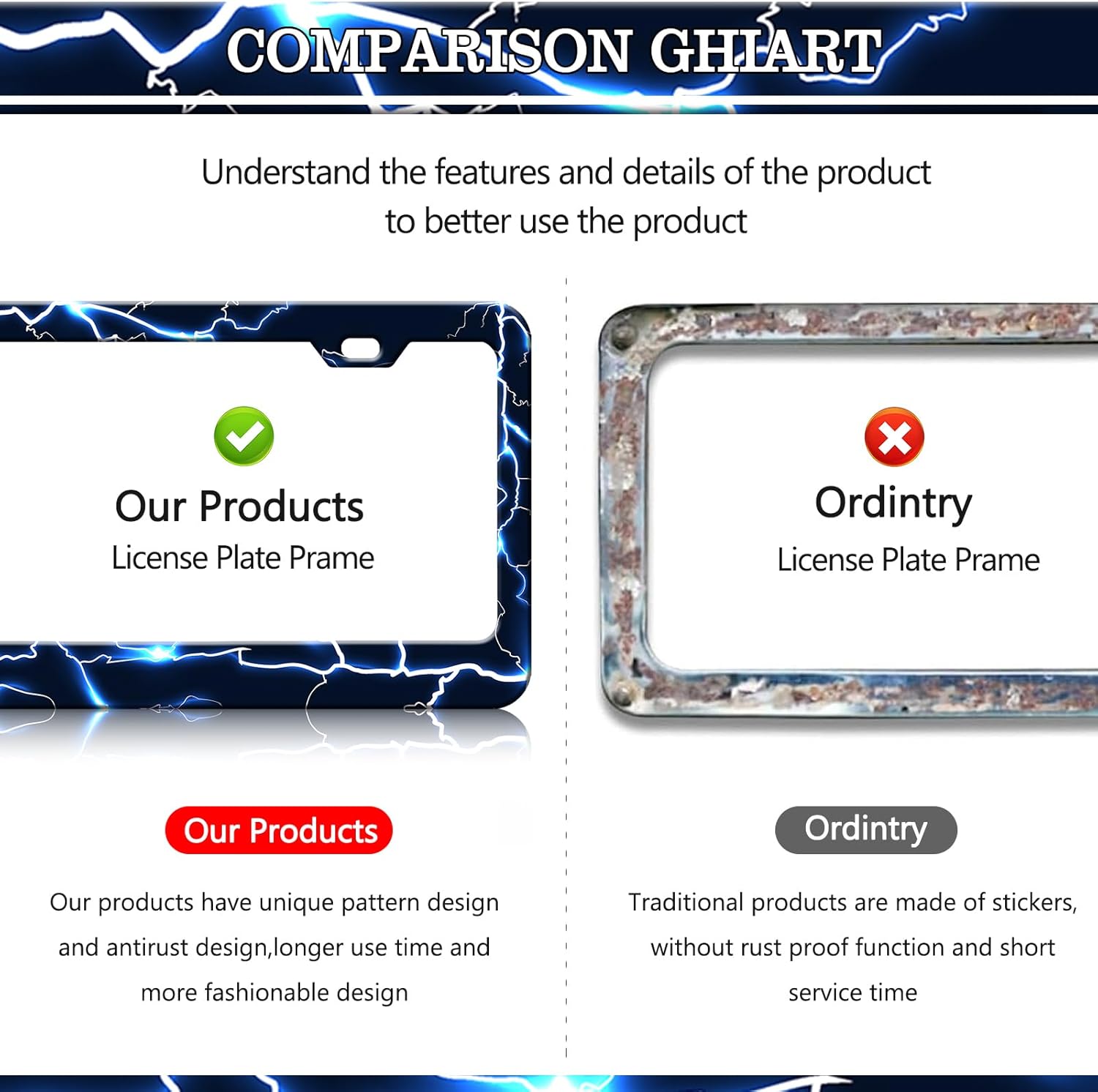 Blue Lightning License Plate Frames - 2 Pack Funny Thunder Stainless Steel License Plate Holder,Rust-Proof Waterproof Car Decorative Tag Frame with Screws Fasteners Caps