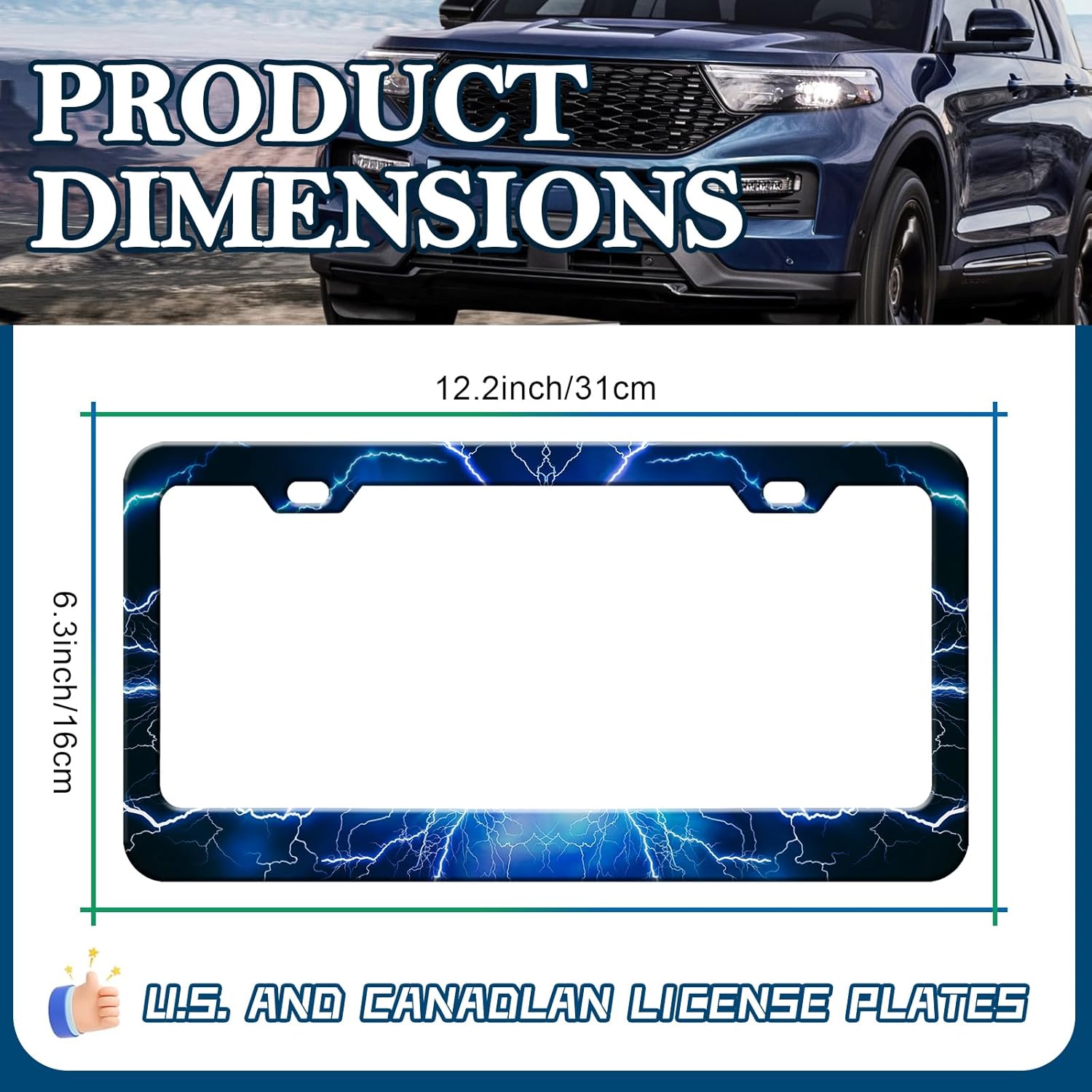 Blue Lightning License Plate Frames - 2 Pack Blue Thunder Stainless Steel License Plate Holder,Rust-Proof Waterproof Car Decorative Tag Frame with Screws Fasteners Caps