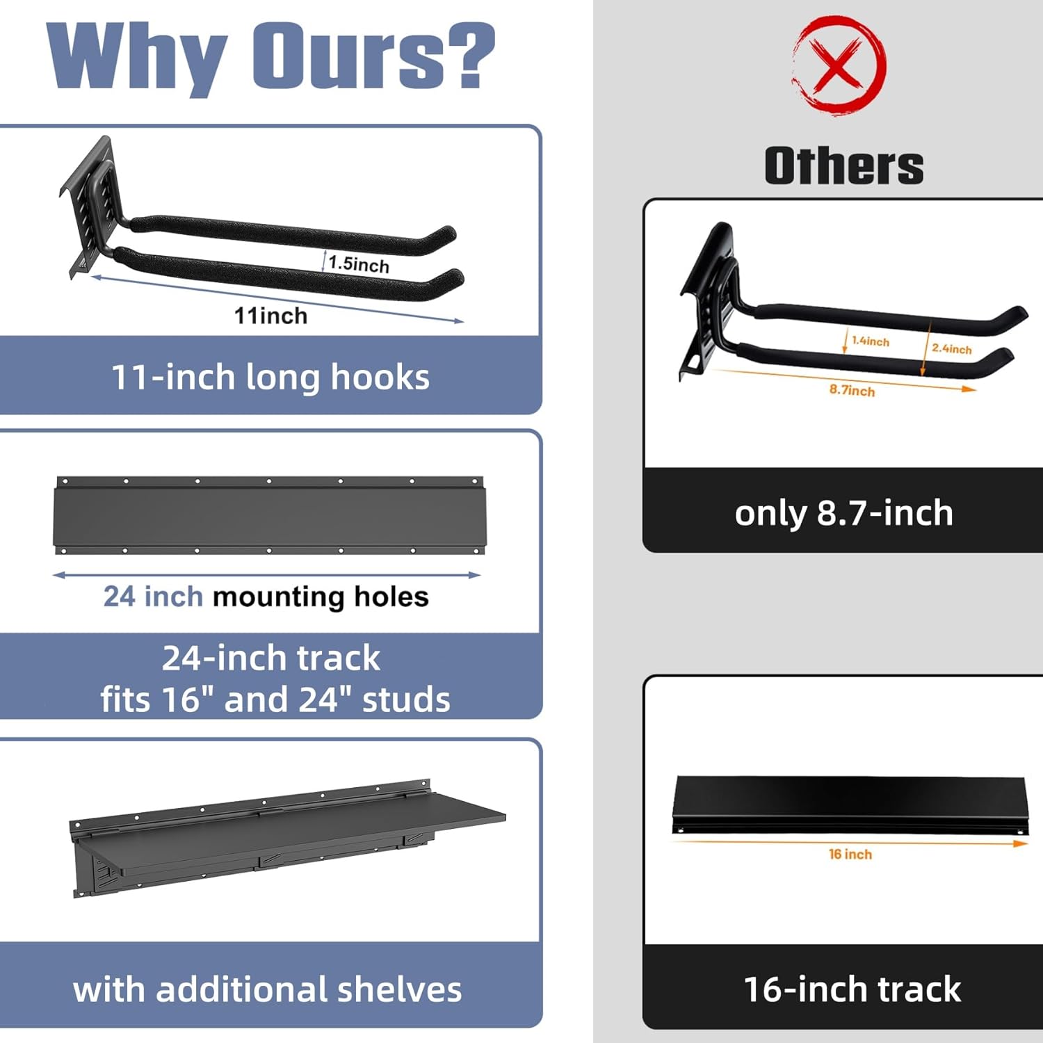 - Easy Installation: Comes with four 24" tracks featuring pre-drilled 16" and 24" mounting holes for secure installation on standard 16" and 24" wall studs. Arrange the tracks to best fit your space