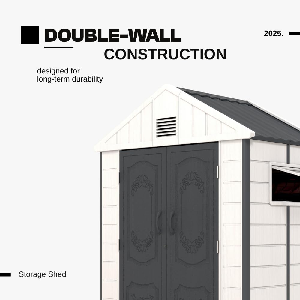 - 【Double-Wall Construction】The steel-reinforced dual-wall and impact-resistant floor are designed for long-term durability, providing resistance against insects, corrosion, and improved waterproofing. (Maximum wind resistance grade: 6 (24-30 mph); Maximum snow thickness tolerance: 6 inches.)