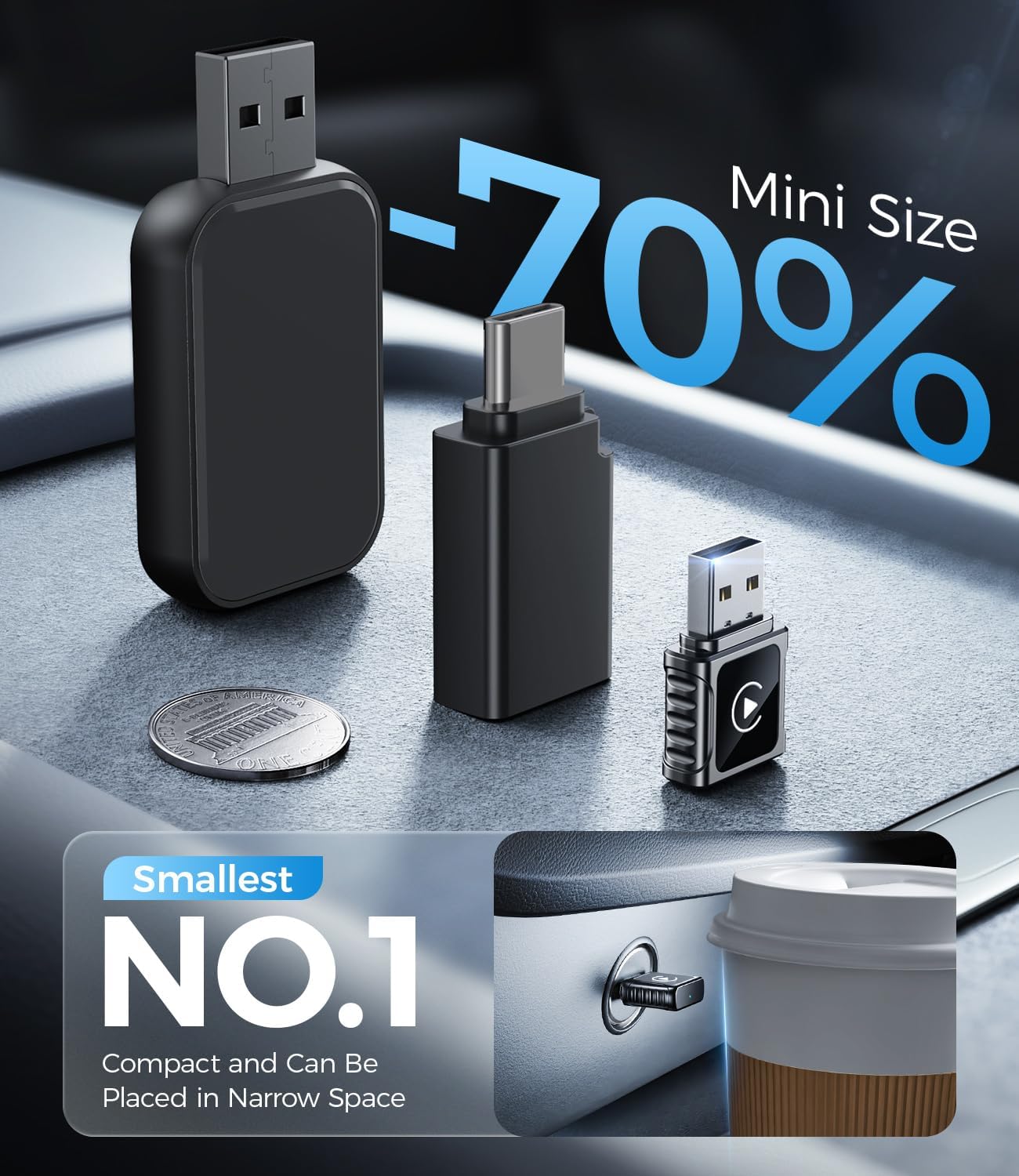 - 👑【Ultra-Mini USB Design】A revolutionary 70% size reduction, redefining in-car aesthetics! This coin-sized design seamlessly integrates into the USB port for a completely invisible installation. Designed for drivers who demand a clean and minimalist cabin—no need to sacrifice any space, eliminate the annoying noise of tangled cables and dangling devices. Watch it vanish into your dash while gaining instant wireless freedom This isn't just an upgrade; it's a custom fit for your car.