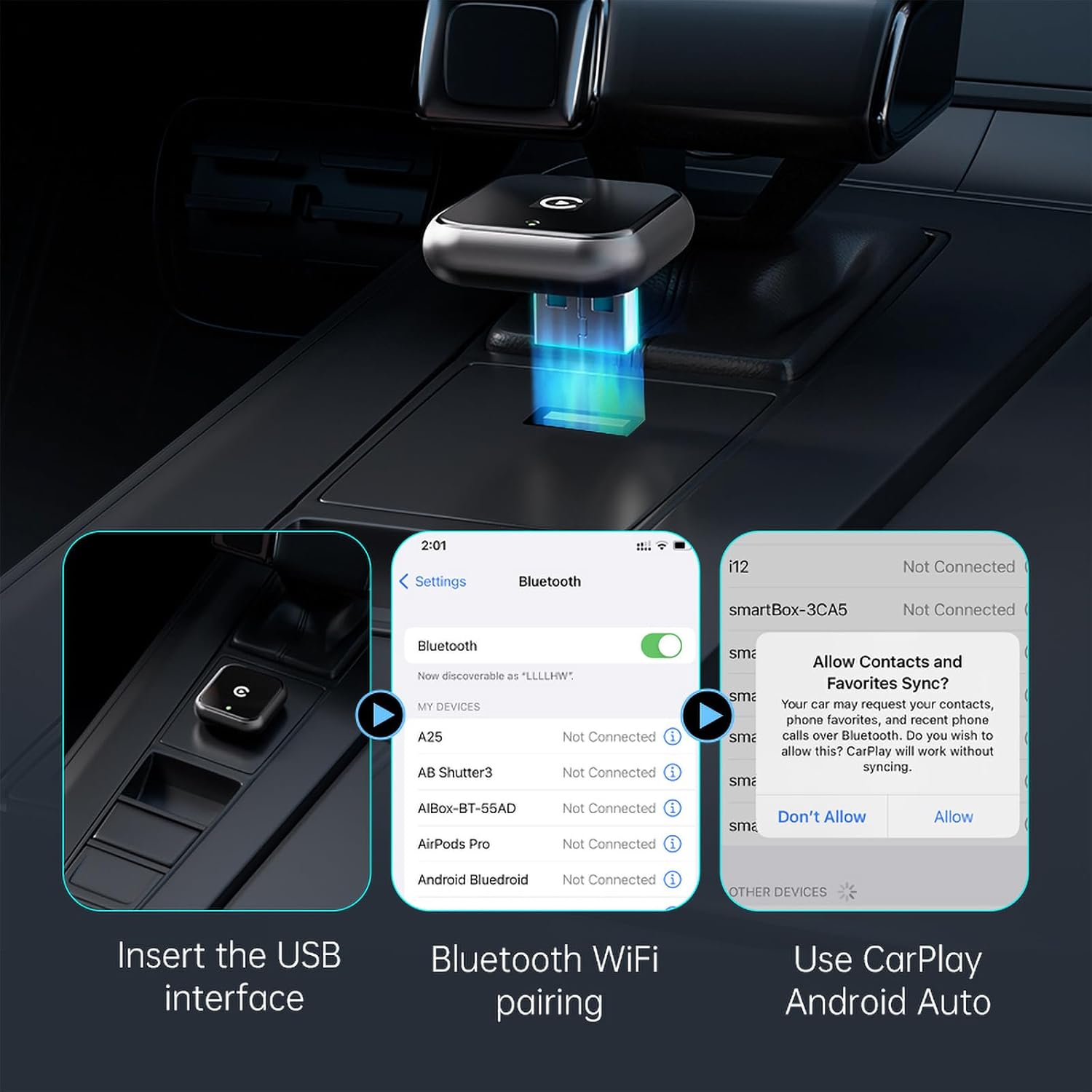 - 【Ultra-Fast Wireless Connection】Get fast access to your favorite CarPlay features such as navigation, music, messages, phone calls, Siri assistant, etc. Our CarPlay adapter uses cutting-edge wireless technology to provide an immediate connection to your vehicle's infotainment system, delivering a performance that outpaces other wireless adapters. Plug and play, with support for automatic reconnection—set it once and benefit from a lifetime.