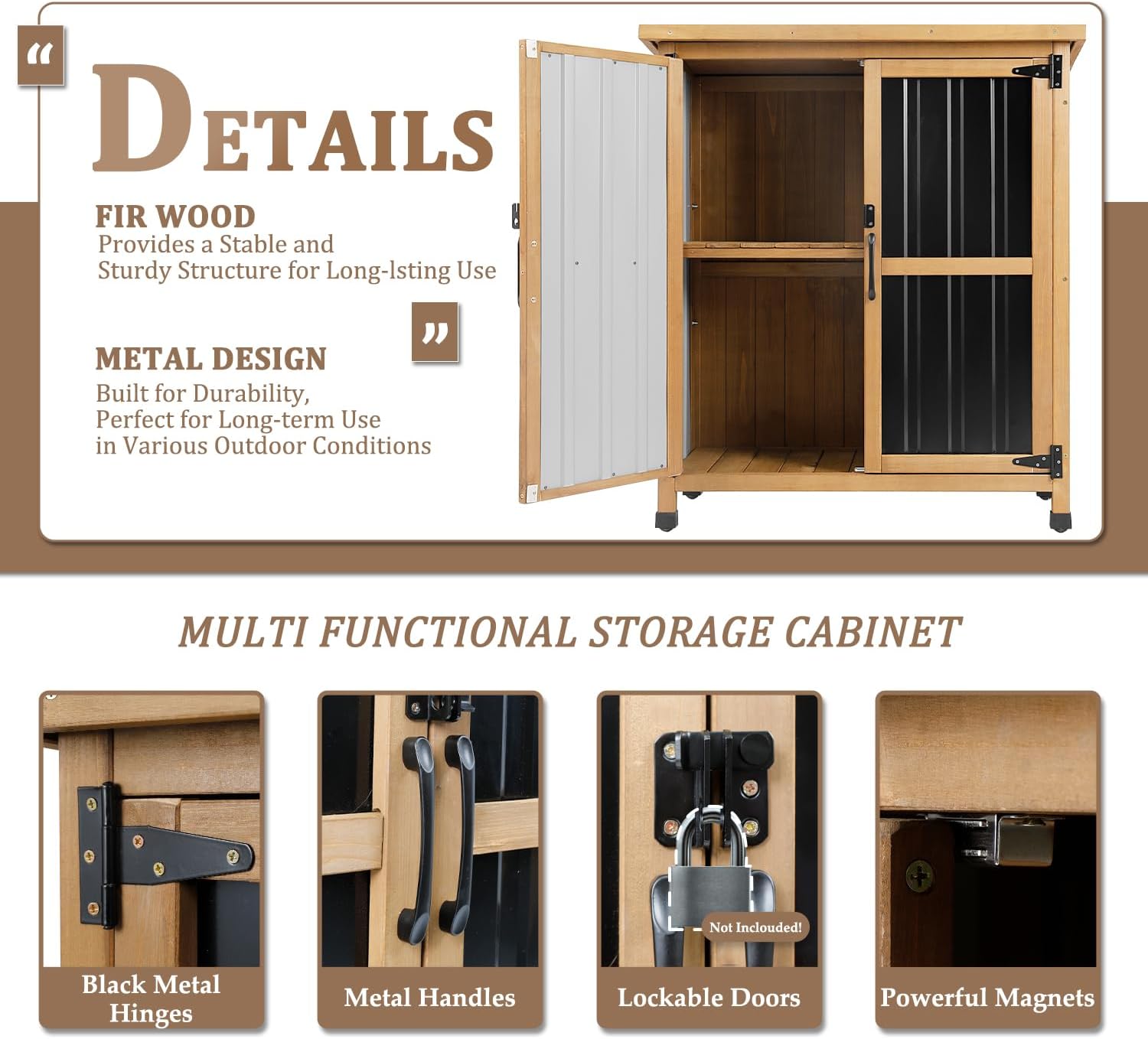 - Secure & Weatherproof: This outdoor storage cabinet waterproof comes with lockable doors and strong magnets for security. The asphalt roof shields against rain, snow, and UV rays—ideal for garden storage cabinets or patio storage cabinet use