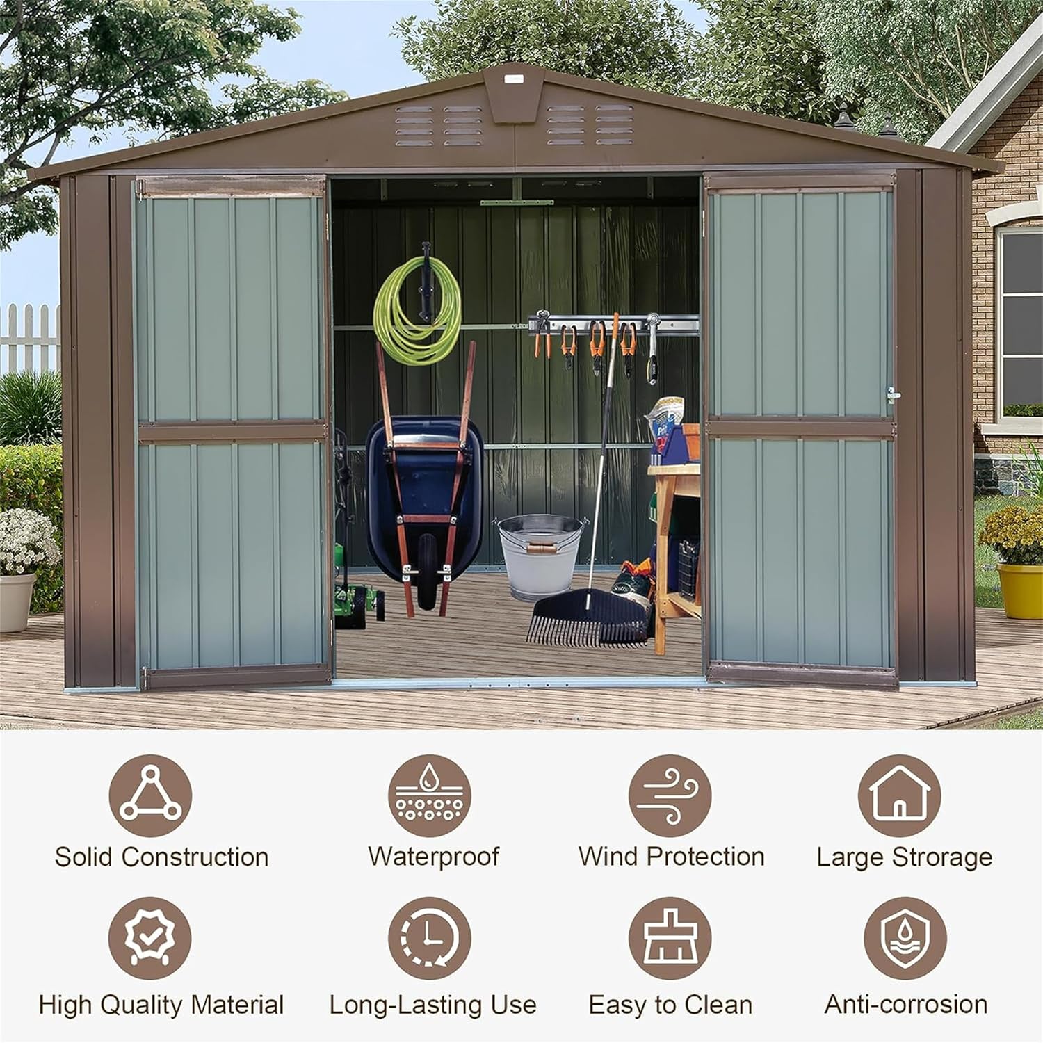 - Spacious & Organized Storage Capacity This shed provides ample space for lawnmowers, bicycles, patio furniture, and more. The intelligently designed interior accommodates shelves or hooks (not included), while wide double doors ensure easy access for bulky items. Say goodbye to cluttered garages and hello to a neatly organized backyard