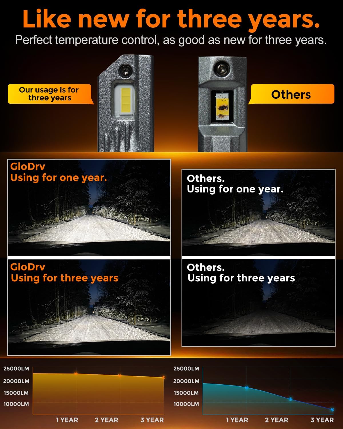 - [As Bright As New After 3 Years] Extreme heat dissipation ensures that the lights always run at a low temperature of 180°F (normal bulbs without heat dissipation are 280-300°F) After 10,000 consecutive hours of continuous lighting test, the brightness decreases by less than 2%, with a total lifespan of more than 10 years, even if you drive for 10 hours a day at night, the lights will still be as bright as brand new after 3 years.