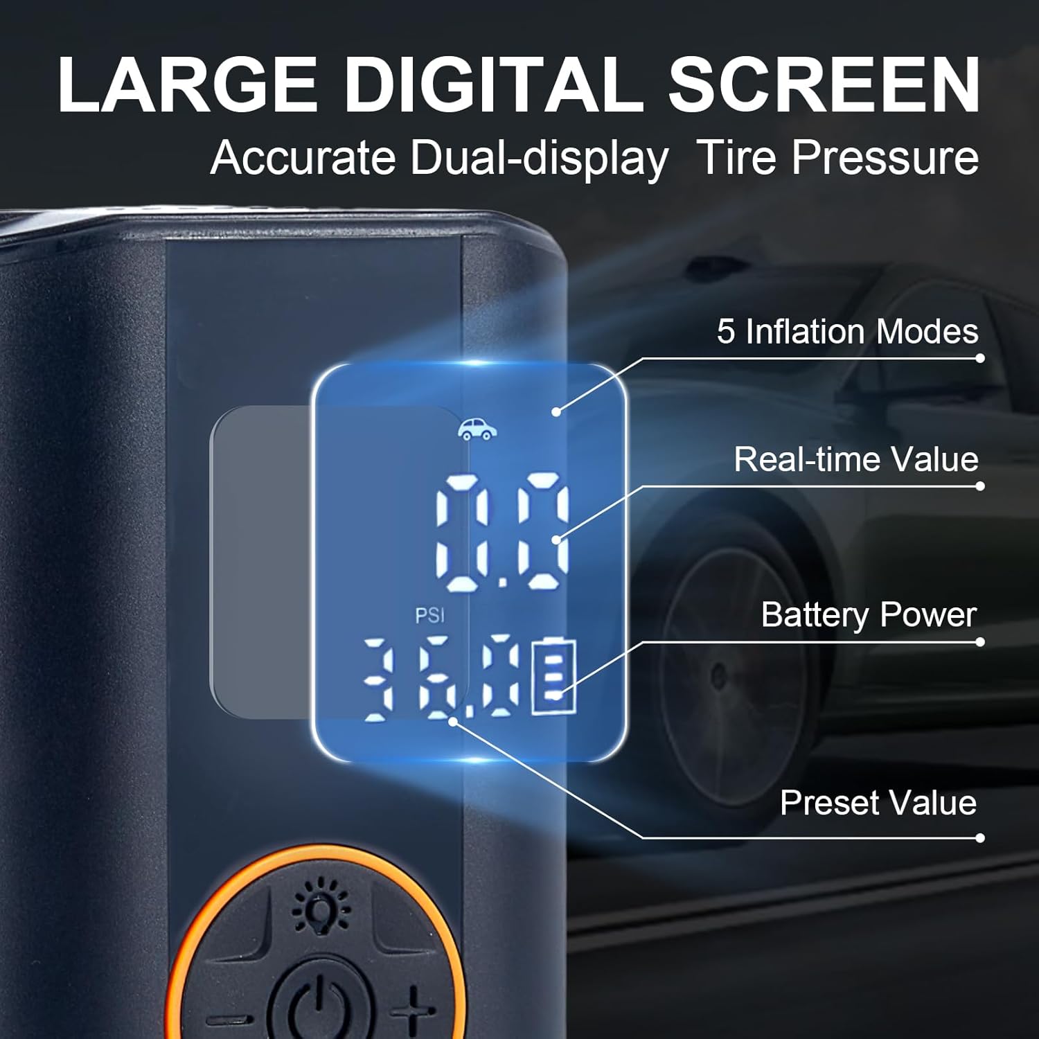 - Digital Screen Display and Auto-Stop - Equipped with a digital screen, it accurately displays the current tire pressure value, offering 4 pressure units for clear visibility. During inflation, you can clearly monitor the tire pressure change, ensuring the tire pressure remains ideal for safe travels. Additionally, the smart tire inflator automatically stops when it reaches the preset pressure, precisely controlling the pressure and avoiding over - inflation risks.