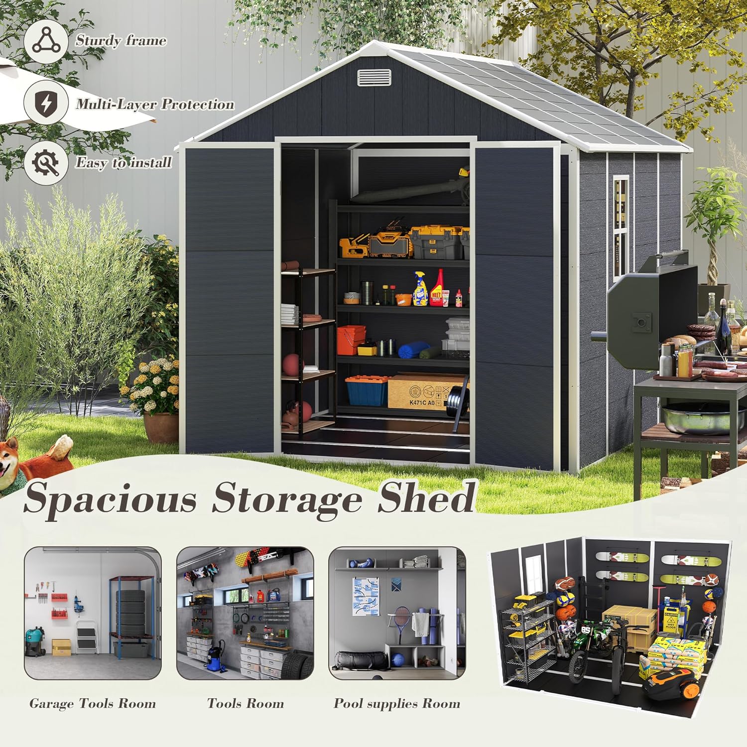 - 【Spacious Interior – Organize Freely & Efficiently】 This 8x8 ft shed offers a generous interior layout perfect for storing gardening tools, outdoor furniture, seasonal gear, and more. Whether used as a tool house, hobby workspace, or equipment storage, its open floor plan adapts to your needs with flexible storage solutions.