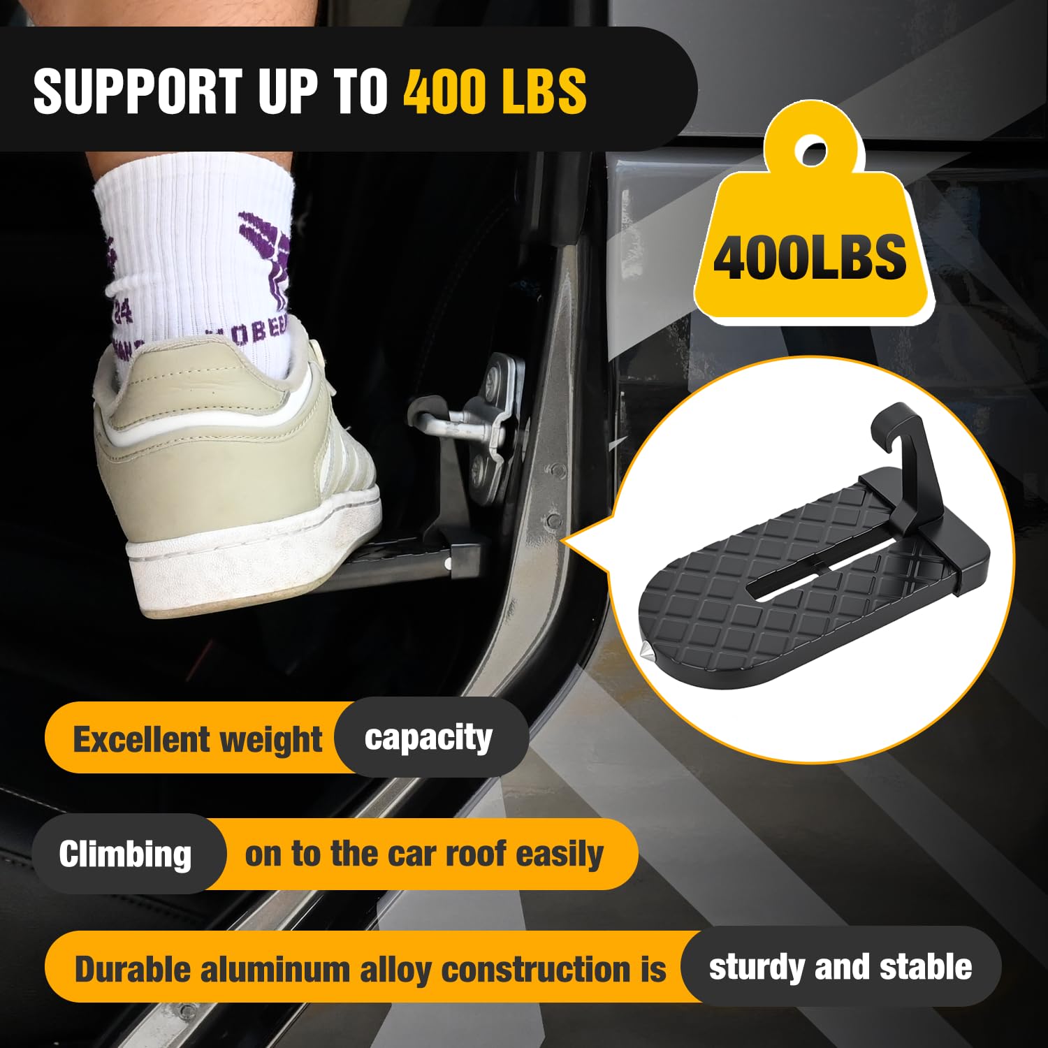- STURDY & DURABLE: This car door latch step is made of high-quality aluminum alloy which is light and sturdy, exceptional strength and longevity. the maximum load capacity can reach 400lbs, it provides reliable support for various tasks. this folding door step is a must-have accessory for easy rooftop access. make your outdoor more convenient and enjoyable