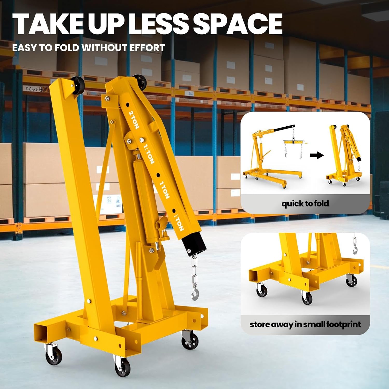 2-Ton Folding Hydraulic Engine Hoist with Lever, Heavy-Duty Engine Crane Cherry Picker with 6 Casters, Shop Lift for Garage, Workshop & Warehouse, Yellow
