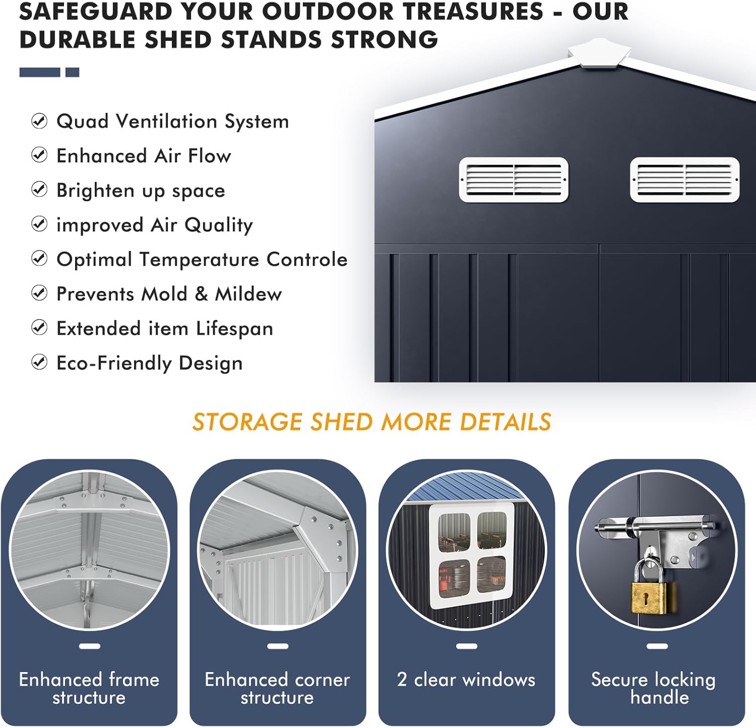 - 🛡️ ALL-SEASON WEATHER DOMINANCE: Engineered to conquer the elements. This shed is constructed with multi-coated, 0.25 mm-thick (30ga) color steel walls and thick 0.4mm door panels, delivering uncompromising protection against rust, corrosion, and UV degradation. The intelligent peaked roof is designed to efficiently shed heavy rain and snow, ensuring the contents of your shed remain safe and dry through blistering summers and harsh winters.