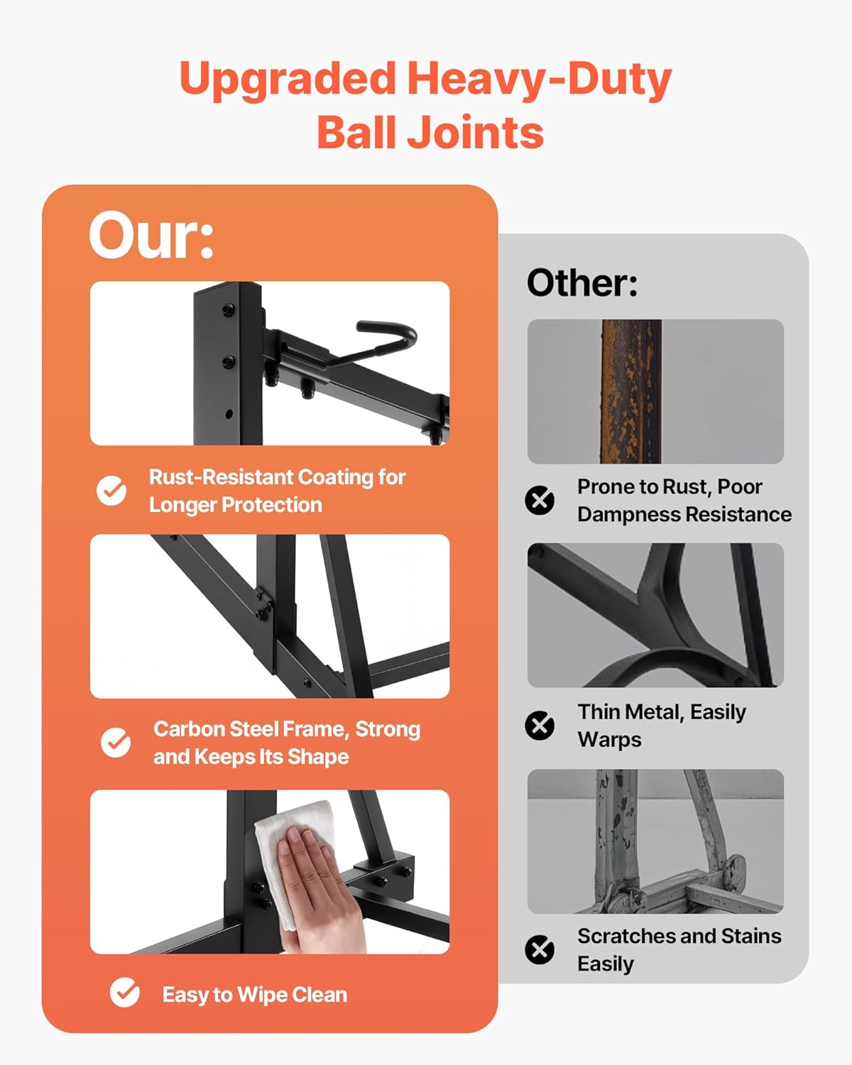 - Built to Last: This garage bike stand has a rust-resistant coating that helps slow down rusting, and the tough carbon steel frame stays strong and won’t deform. It’s a one-time buy that’ll serve you for years to come