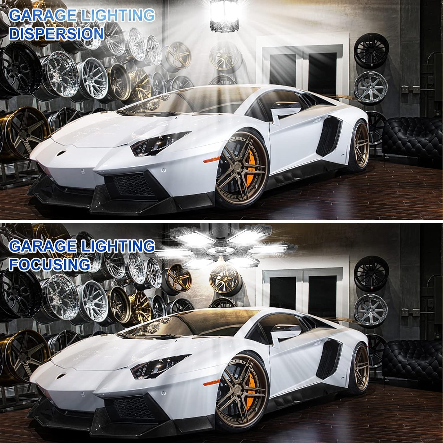- Garage Lights with 360° illuminated range 90°Adjustable : This garage light is 8 panels design, each panel can be adjusted within the range of 0-90°, you can just tighten the screw to provide the correct lighting angle socket, and has a 360° illumination coverage range. The led garage ceiling lights with 357 lamp beads can illuminate the whole garage basement workshop and so on.