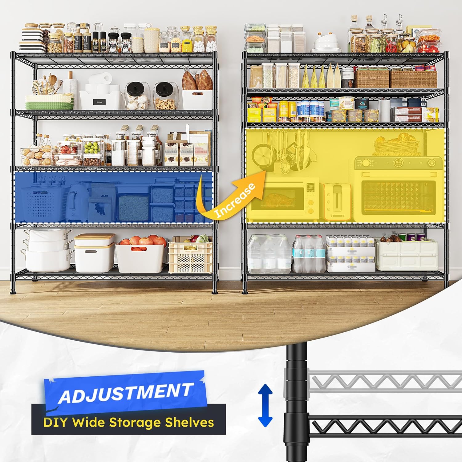 - Adjustable Wire Shelf Heights for Flexible Storage:The height of each tier on this adjustable metal shelving unit can be customized to fit items of any size. Locking clips keep shelves firmly in place—perfect for tall kitchen appliances, pantry goods, or storage bins.