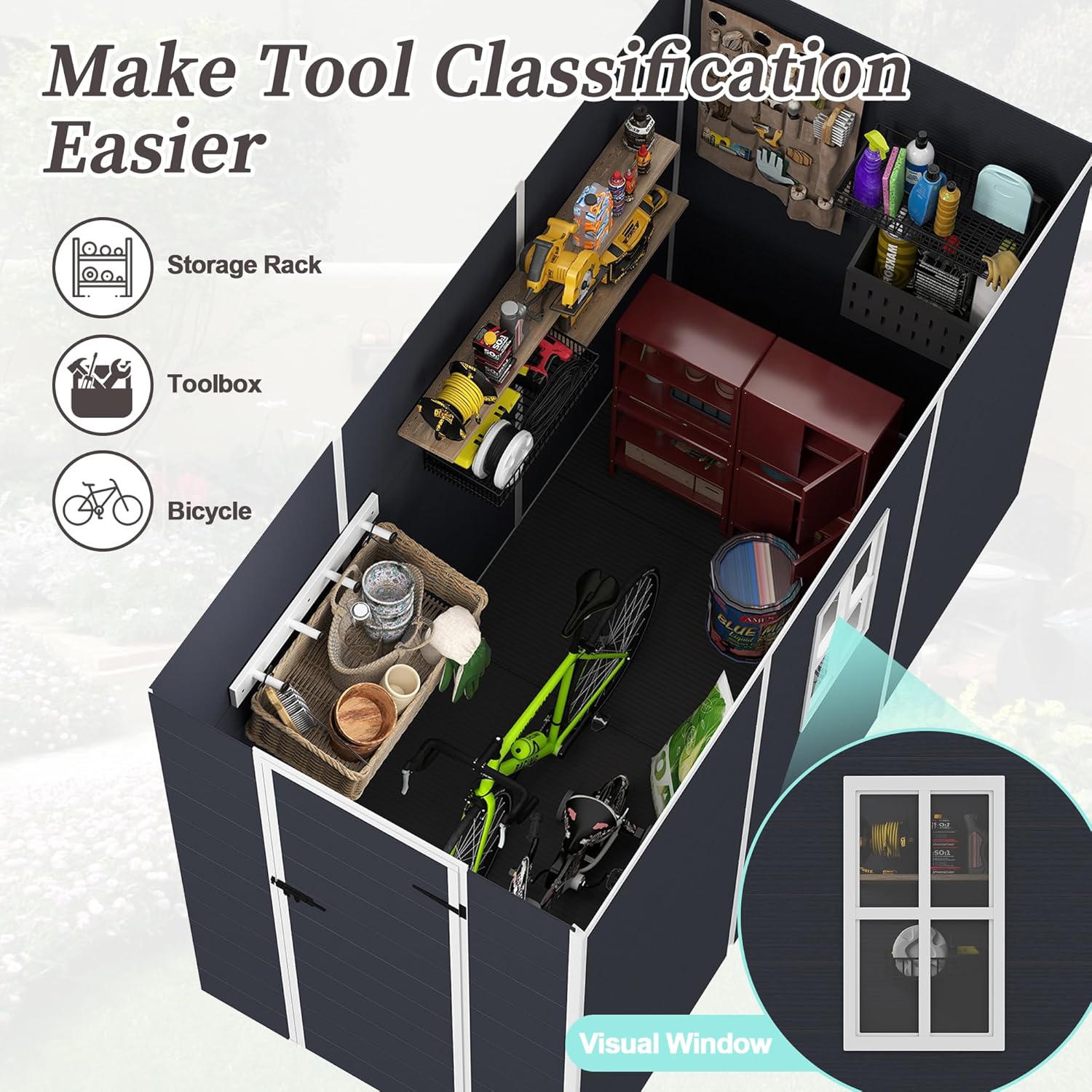 - 🏠 【Integrated Vents & Clear Window】Designed for airflow and visibility, this garden shed features louvered vents above the door to enhance ventilation and reduce moisture buildup. A crystal-clear side window fills the interior with natural light, eliminating dark corners and making it easier to find your tools and supplies