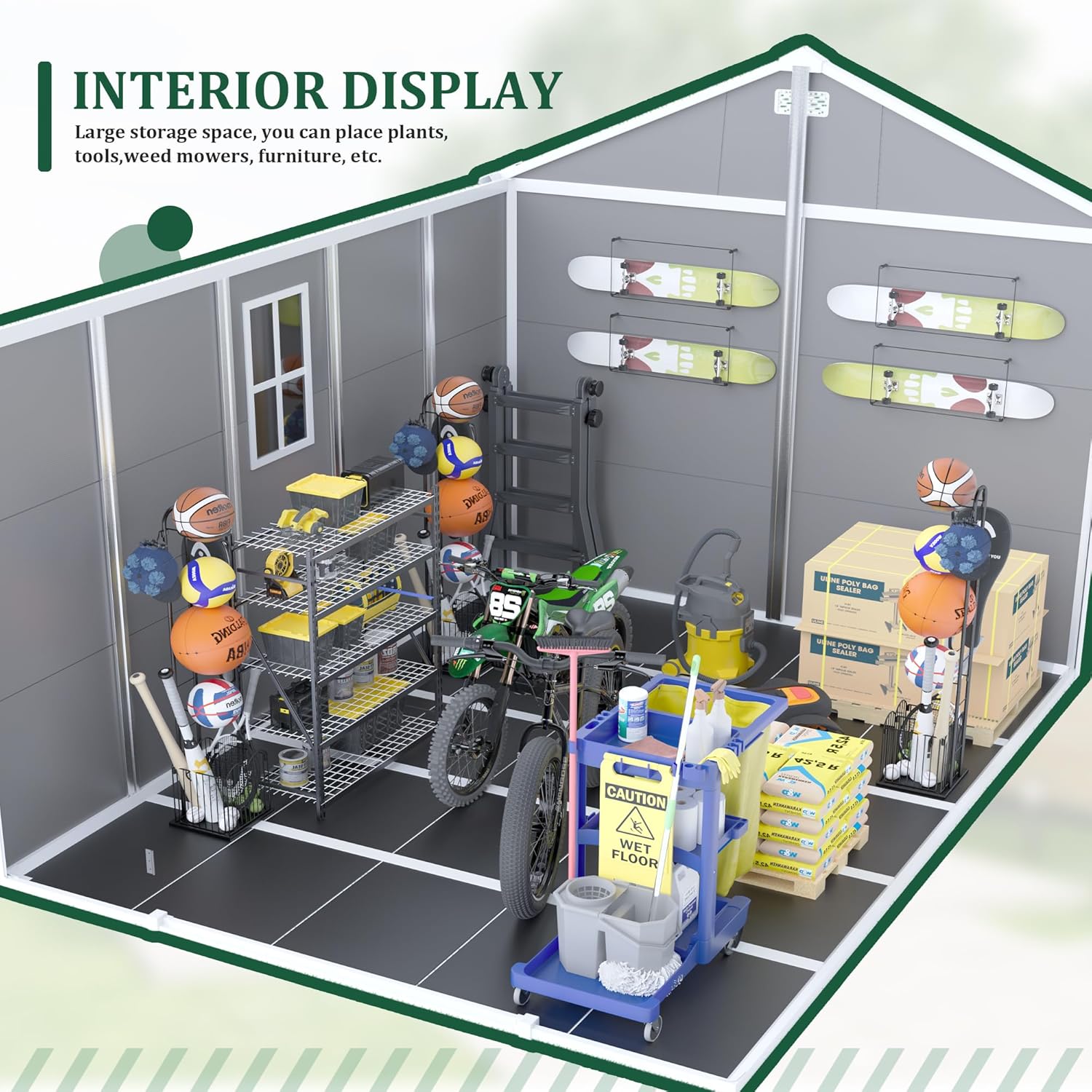 - š ćAll-Weather Resin DurabilityćCrafted from high-quality plastic resin, this resin shed is built to handle rain, snow, and sunlight with ease. The waterproof and UV-resistant exterior helps protect your stored items all year long, while the reinforced double-wall panels add strength and thermal stability for lasting outdoor performance