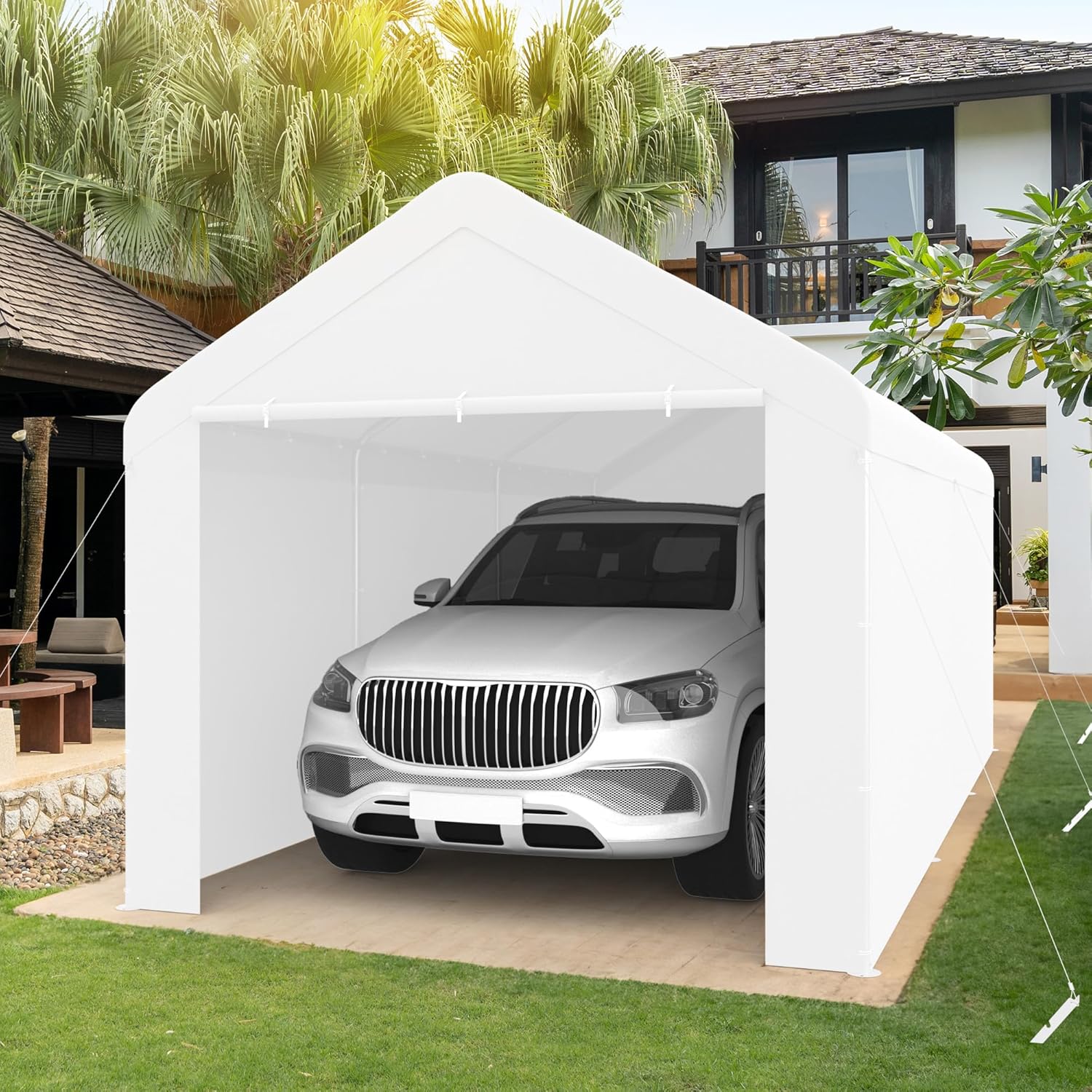 - PORTABLE CANOPY: Car ports 10x20 heavy duty with roller shutter zip door chains & buckles for easy vehicle access,needn't to remove the side walls of the car tent, well ventilated against heat and moisture.