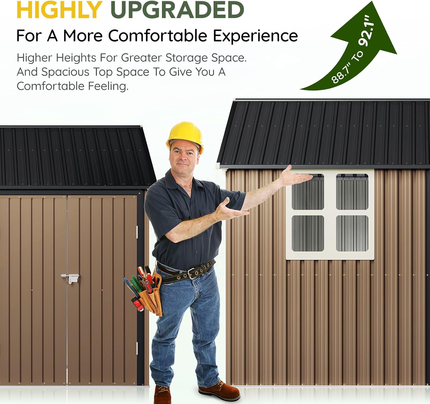 Breezz 8X10FT Outdoor Steel Storage Shed with Clear Window, Lockable Doors, Weather-Resistant Metal Tool Shed for Garden, Backyard, Patio, and Utility Storage.Brown