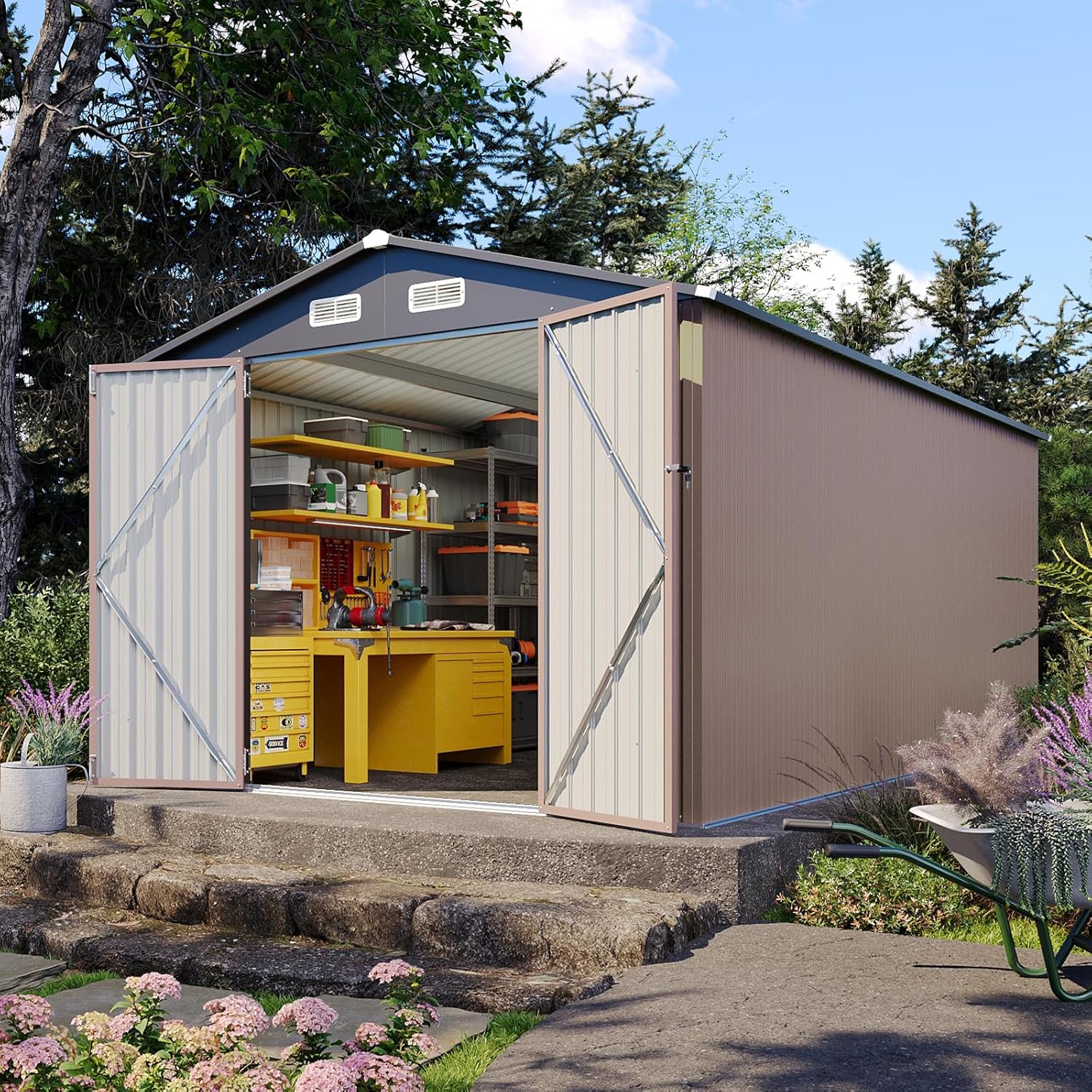Aoxun 8 x 15FT Outdoor Storage Shed with Double Hinged Large Door Utility Garden Shed with Lockable Door & Sloped Roof Metal Sheds Outdoor Storage for Garden, Backyard, Patio and Backyard, Brown