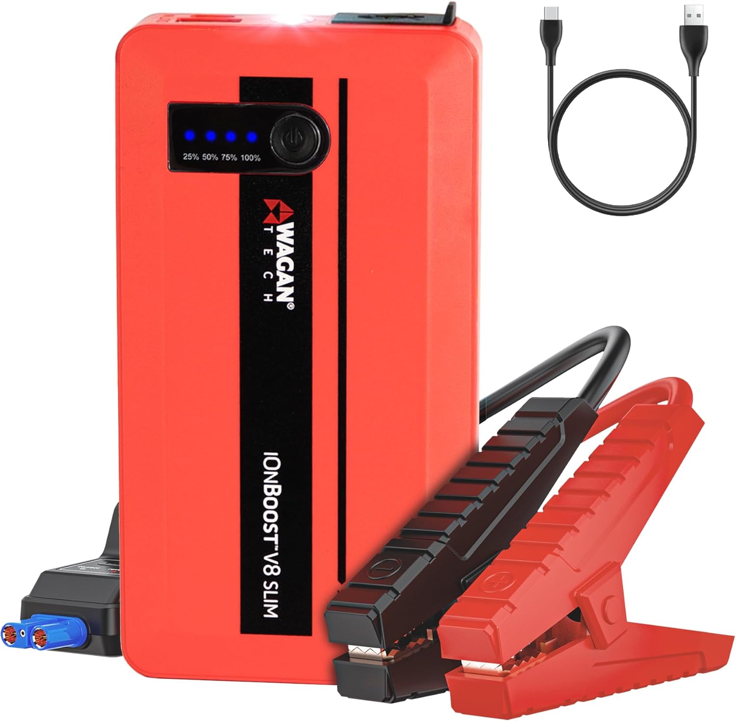 - [Multi-function Backup Power Bank] Wagan iOnBoost V8 Slim is not just a jump starter—it also functions as a portable 8000mAh power bank, with USB charging ports for your phone, tablet, or other small USB-powered devices. A perfect companion for road trips, camping, or emergencies when your electronics need a boost.