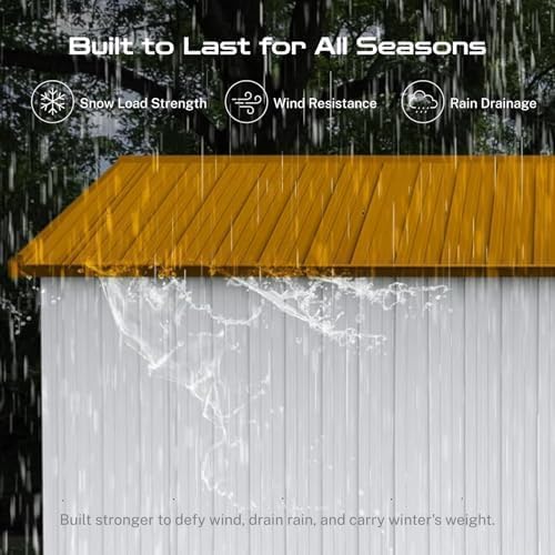 - ☔ [Sloped Roof for Superior Weather Protection] Designed for real-world conditions, the efficient sloped roof system guarantees optimal rainwater drainage, preventing damaging pooling and leaks. This key feature in our storage buildings and sheds clearance design minimizes maintenance and ensures your tools, equipment, and belongings stay consistently dry inside