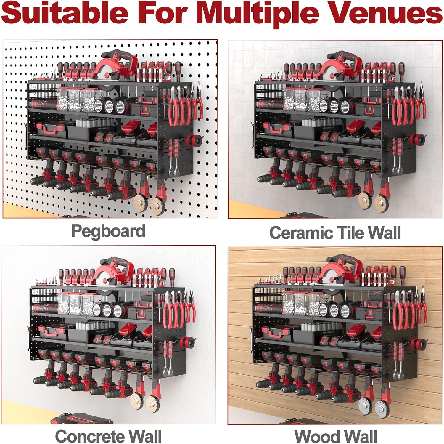 - Order in the Garage: This wall-mounted drill holder can hold more than 50 tools, transforming cluttered garages into organized havens.You no longer need to waste time searching for tools, cordless tool organizer for warehouse, garages, workshops,pegboards,backyard shops, sheds, and more